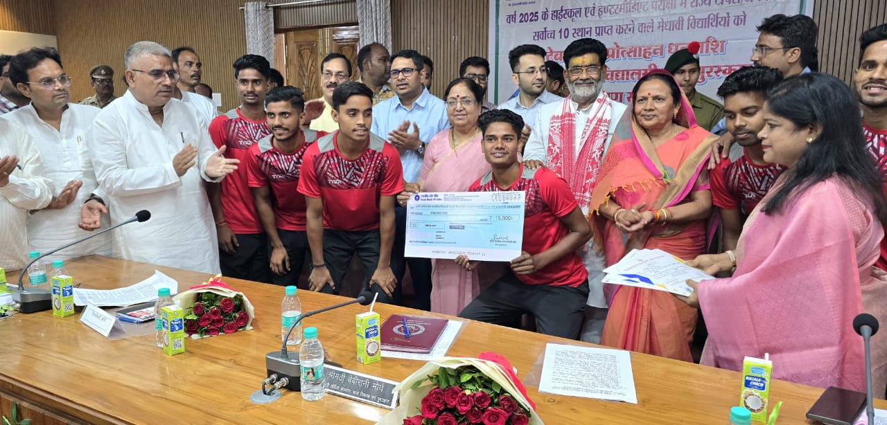 झांसी। जनपद में गुरुवार को कलेक्ट्रेट स्थित नवीन सभागार में आयोजित यूपी बोर्ड इंटरमीडिएट और हाईस्कूल परीक्षा-2025 के मेधावी छात्र-छात्राओं का सम्मान समारोह कार्यक्रम में मेधावियों का सम्मान किया गया। चेहरे पर खुशी और आंखों में आत्मविश्वास से लबरेज मेधावियों का नाम पुकारते ही नवीन सभागार तालियों की गड़गड़ाहट से गूंज उठा। प्रदेश स्तर पर केंद्र राज्य स्तरीय बोर्ड परीक्षाओं में उच्च अंक प्राप्त मेधावी छात्र-छात्राओं का सम्मान टैबलेट वितरण, 68 वी राष्ट्रीय विद्यालय खेल प्रतियोगिता में स्वर्ण पदक रजत एवं कांस्य पदक विजेता उत्तर प्रदेश के खिलाड़ियों को मुख्यमंत्री विद्यालयी खेल पुरस्कार वितरण सहित विभिन्न नवीन भवनों के शिलान्यास कार्यक्रम का आयोजन माननीय मुख्यमंत्री योगी आदित्यनाथ की अध्यक्षता में लोक भवन सभागार लखनऊ में संपन्न हुआ कार्यक्रम के सजीव प्रसारण को जनपद स्तर पर कलेक्टर नवीन सभागार मेंसमस्त जन प्रतिनिधि,अधिकारी एवं मेधावी छात्र-छात्राएं और अभिभावकों ने देखा व सुना। मुख्यमंत्री के कार्यक्रम के पश्चात जनपद में कलेक्टर नवीन सभागार में आयोजित कार्यक्रम में वर्ष-2025 के बोर्ड परीक्षाओं के मेधावियों के सम्मान समारोह में मेधावियों से कहा गया कि ये तो शुरुआत है, मेहनत और लगन से हर मंजिल आसान हो जाती है। कार्यक्रम में करीब 30 मेधावियों को सम्मानित किया गया, जिसमें खिलाड़ी भी शामिल रहे। गुरुवार कलेक्ट्रेट स्थित नवीन सभागार में कार्यक्रम का शुभारंभ प्रभारी मंत्री महिला कल्याण बाल विकास एवं पुष्टाहार विभाग उत्तर प्रदेश शासन श्रीमती बेबी रानी मौर्य की अध्यक्षता में आयोजित किया गया। उत्तर प्रदेश माध्यमिक शिक्षा परिषद के 10वीं और 12वीं में सर्वोच्च अंक पाने वाले 10-10 विद्यार्थियों को आमंत्रित कर रुपए 21,000 का सांकेतिक चेक एक टैबलेट प्रशस्ति पत्र तथा मेडल देकर सम्मानित किया गया। प्रभारी मंत्री जी द्वारा जैसे ही मेधावियों को सम्मानित करना शुरू किया, पूरा हाल तालियों की गड़गड़ाहट से गूंज उठा। इस अवसर पर 68 वीं विद्यालयी मुख्यमंत्री खेल पुरस्कार हेतु प्रदेश स्तर पर बॉक्सिंग प्रतियोगिता में जनपद के अदनान अब्बासी को रजत पदक प्राप्त करने पर ₹50000 एवं प्रबल प्रताप सिंह को कांस्य पदक प्राप्त करने पर ₹30000 की धनराशि प्रदान की गई। इसके अतिरिक्त 68वीं विद्यालयी मुख्यमंत्री खेल पुरस्कार हेतु जनपद की हॉकी टीम ने प्रदेश स्तर पर कांस्य पदक प्राप्त किया। पुरस्कार स्वरूप हॉकी टीम के रुपए 15000 प्रमाण पत्र और मेडल सहित धनराशि प्रति सदस्य प्रदान की गयी। श्रीमती बेबी रानी मौर्य मंत्री महिला कल्याण बाल विकास एवं पुष्टाहार विभाग ने उपस्थित मेधावी छात्र-छात्राओं, अभिभावक एवं शिक्षको