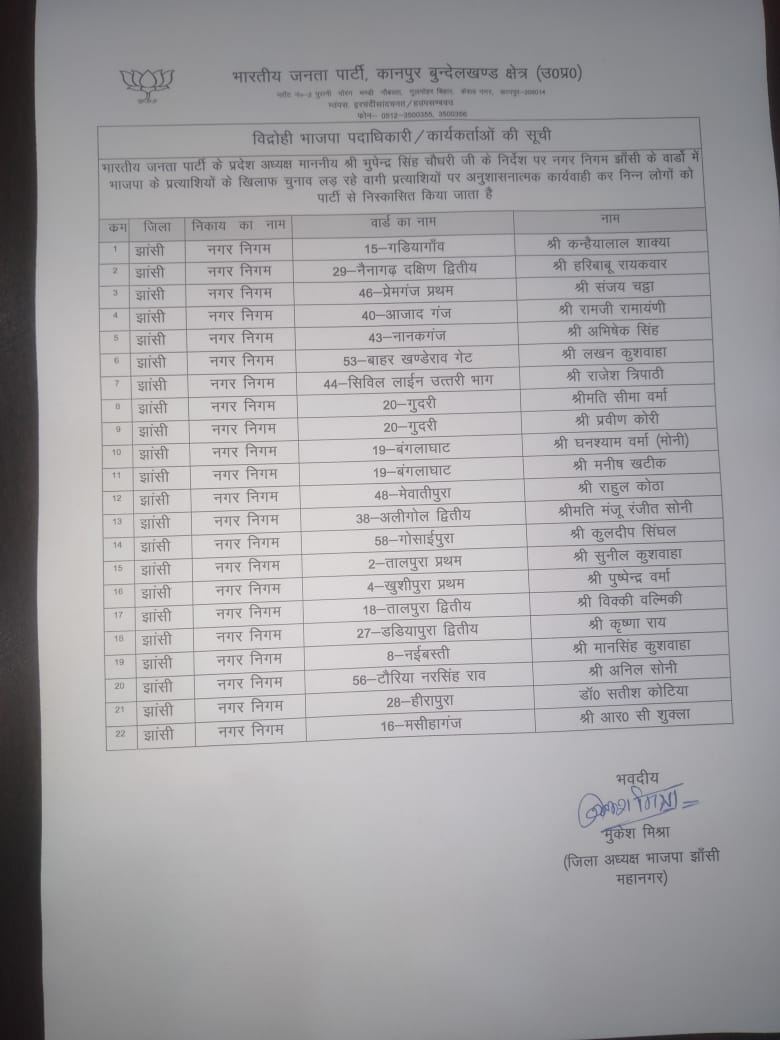 झांसी। पार्टी में अनुशासनहीनता और विद्रोह कर पार्टी के विरोध में चुनाव लड़ रहे 27 बागियों पर भाजपा पार्टी ने कार्यवाही करते हुए उन्हें पार्टी से निष्काशित कर दिया है। आपको बता दे की गत दिवस झांसी आए भाजपा के प्रदेश अध्यक्ष ने पार्टी से बगावत करने वालों को चेतावनी दी थी की अगर पार्टी विरोधी क्रियाकलाप करेंगे तो कार्यवाही की जाएगी। प्रदेश अध्यक्ष की बात पर कई बागी मान गए थे और पार्टी के हित में कार्य करने लगे थे। लेकिन जिन्होंने पार्टी विरोधी कार्य किया उन पर आज कार्यवाही कर दी गई है।सूची में देखे निष्काशित किए गए लोगों के नाम।