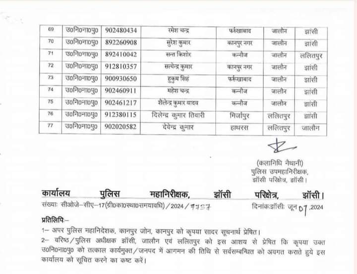झांसी। लोकसभा चुनाव के बाद पुलिस महकमे में तबादले होने की शुरुआत हो गई है। जनपद झांसी में पिछले लंबे समय से तैनात उपनिरीक्षक शासन के निर्देश पर गैर जनपद स्थानांतरित हुए थे। लेकिन लोकसभा चुनाव के मद्देनजर इन्हे रिलीव नही किया गया था। चुनाव होने के बाद आदर्श आचार संहिता समाप्त होने के बाद अब इन्हे रिलीव कर दिया गया है। सूची में देखे कौन कौन हुए जनपद झांसी से गैर जनपद स्थानांतरित।