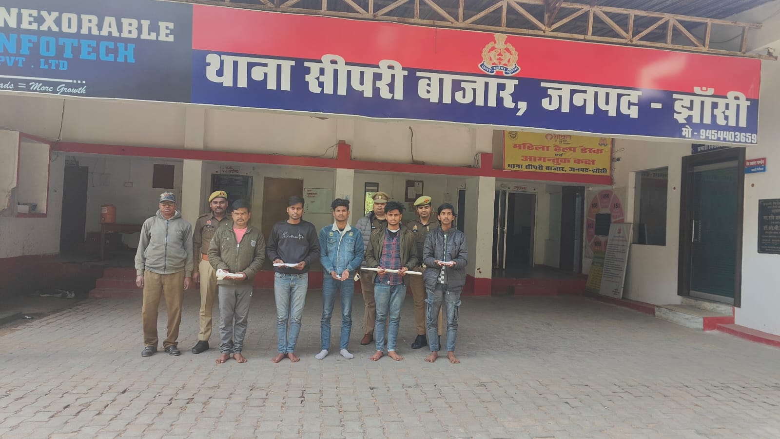 झांसी। चोरी की योजना बनाते पांच शातिर चोरों को देर रात पुलिस ने दबोच लिया। पुलिस ने पकड़े गए चोरों के कब्जे से लोहे की सब्बल, तमंचा कारतूस सहित चोरी करने के उपकरण बरामद कर लिए। पुलिस ने पकड़े गए सभी आरोपियों के खिलाफ मुकदमा दर्ज कर उन्हे जेल भेज दिया है।जानकारी के मुताबिक सीपरी बाजार थाना पुलिस वांछित अपराधियों की धरपकड़ में लगी थी। तभी सूचना मिली की रेल लाइन किनारे कच्ची रास्ता पर कुछ शातिर बदमाश छिपे हुए है। पुलिस ने सूचना पर मौके पर पहुंच कर घेराबंदी करते हुए पांच संदिग्धों को दबोच लिया। पकड़े गए आरोपियों ने अपने नाम प्रेमनगर थाना क्षेत्र के गढ़िया गांव निवासी सुंदर सिंह जाटव, नगरा गुरुद्वारा के पास निवासी रोहन कुशवाह, मध्य प्रदेश के जिला शिवपुरी करैरा निवासी बृजेश जाटव, गौरव परिहार, प्रेमनगर के नगरा प्रताप पुरा निवासी अनुराग शर्मा उर्फ सूरज बताया। पुलिस ने इनके कब्जे से लोहे की संबल, एक तमंचा, दो कारतूस, चाबियो का गुच्छा, स्प्रिंग, कटर बरामद किया। पुलिस के मुताबिक पकड़े गए पांचों संदिग्ध शातिर चोर है और यह मौका पाते ही सूने घरों के ताले चटका कर चोरी की घटना को अंजाम देते है। इन पर दर्जनों अपराधिक मामले दर्ज है।