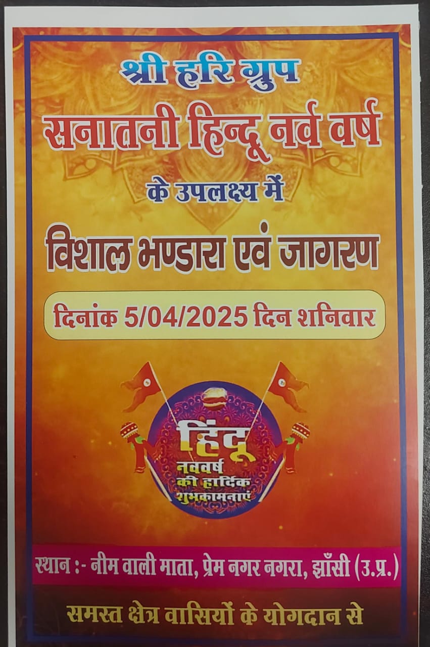 झांसी। प्राचीन सिद्ध पीठ नीम वाली माता मन्दिर पर नवदुर्गा उत्सव पर विशाल भंडारे का आयोजन किया जा रहा है। यह जानकारी मंदिर के भक्त यश ठाकुर ने दी। यह ठाकुर ने जानकारी देते हुए बताया कि नवदुर्गा उत्सव पर आज पांच अप्रैल 2025 को शाम सात बजे से सिद्ध पीठ नीम वाली काली माता मन्दिर दरबार में विशाल भंडारे का आयोजन किया जा रहा है। उन्होंने सभी भक्तजनों से अपील करते हुए कहा कि अधिक से अधिक भक्त जन भंडारे में शामिल होकर पुण्यलाभ कमाए।