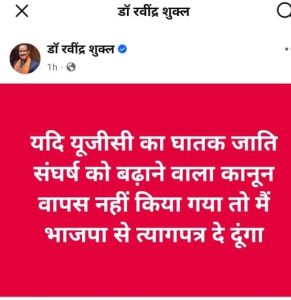 झांसी के वरिष्ठ भाजपा नेता उत्तर प्रदेश सरकार के पूर्व शिक्षा मंत्री रविंद्र शुक्ल ने अपने सोशल मीडिया के फेसबुक अकाउंट पर चेतावनी देते हुए लिखा है कि अगर यूजीसी कानून वापस नहीं किया गया तो वह भाजपा से त्याग पत्र दे देंगे। पूर्व मंत्री रविंद्र शुक्ल की चेतावनी के बाद राजनीतिक गलियारे में हलचल तेज हो गई।