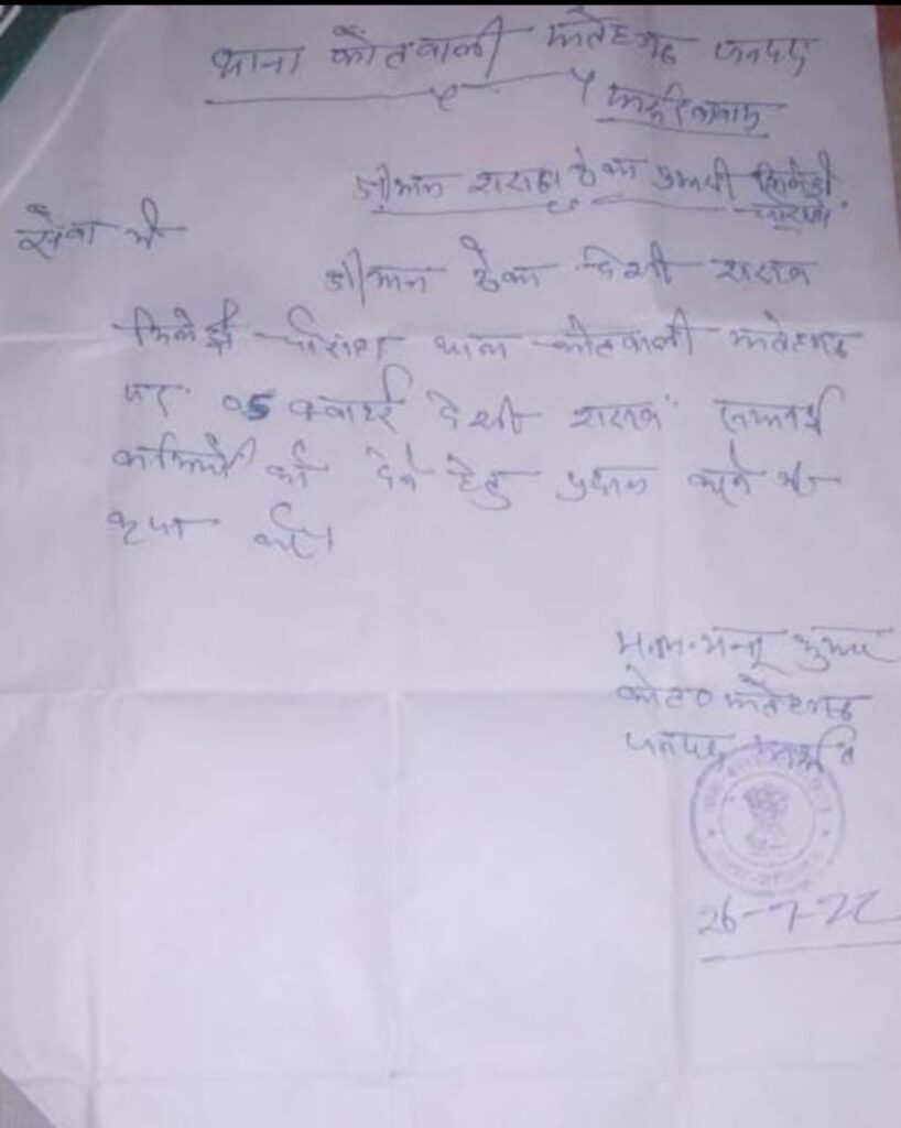 फतेहगढ़। शोशल मीडिया पर यूपी पुलिस पिछले कई दिनों से चर्चाओं का विषय बन रही। कभी कार खास की वसूली सूची जारी होने से तो कभी तमंचे पर डिस्को और देखिए थाना में सफाई कर्मियों को पांच देशी क्वाटर देने के लिए फतेहगढ़ के एक हेड मोहरीर ने पत्र लिखकर उस पर थाना की मोहर भी लगा दी। मामला शोशल मीडिया पर वायरल होने के बाद हेड मोहरिर को निलंबित कर दिया गया है।क्या है मामला हेड मुहर्रिर का कारनामा,पत्र लिख कर मांगे शराब के क्वाटर,निलंबितफतेहगढ़ के मिलिट्री चौराहा स्थित देसी शराब ठेका को हेड मोहर्रिर द्वारा लिखा गया था पत्रफतेहगढ़ कोतवाली की मोहर लगा पत्र वायरल होने के बाद शहर में बना चर्चा का विषयवरिष्ठ अधिकारियों के संज्ञान मे आते ही पत्र लिखकर देशी शराब के 5 क्वार्टर मांगने वाले हेड मोहर्रिर को तत्काल प्रभाव से किया गया निलंबित।