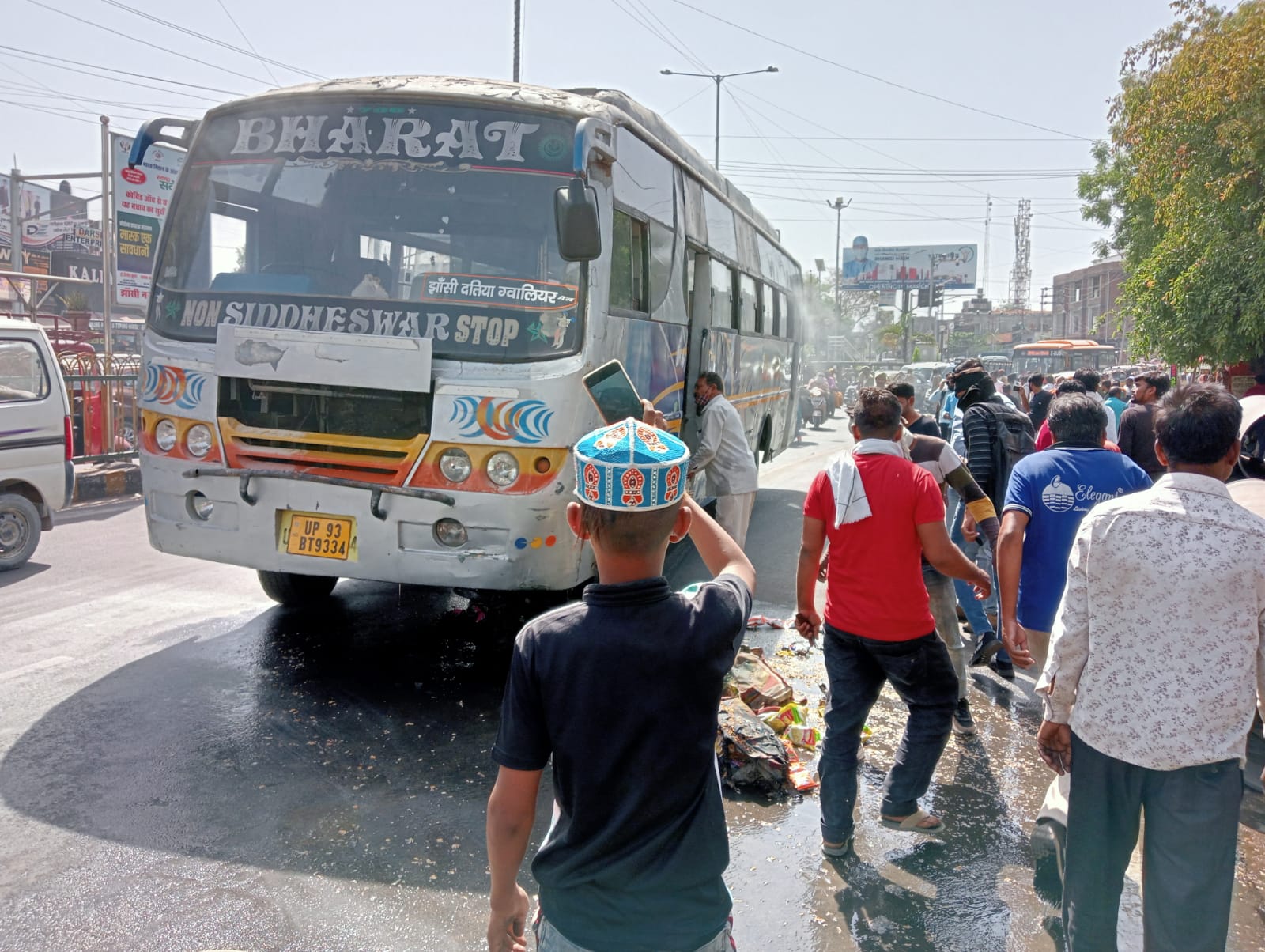 झांसी। जेल चौराहे पर उस समय अफरा तफरी का माहोल बन गया। जब एक बाइक सवार को कुचल कर बाइक सहित उसे घसीटती हुई भाग रही बस में अचानक आग लग गई। बस में आग लगने से भगदड़ मच गई। आनन फानन में मौके पर पहुंची फायर बिग्रेड ने आग को बुझाया। फिलहाल बस में बैठी सावरियो में कोई जनहानि नही हुई। पुलिस ने मृतक बाइक सवार के शव को कब्जे में लेकर पोस्टमार्टम के लिए भेज दिया है।जानकारी के मुताबिक नवाबाद थाना क्षेत्र के झोंकन बाग नारायण धर्मशाला के पास निवासी आनंद अरोरा सेल्स मैन का काम करता है। आज दोपहर करीब डेढ़ बजे आनंद अपनी बाइक से दुकानों को सामान देकर कचहरी चौराहा से जेल चौराहा की ओर आ रहा था। उसी समय पीछे से तेज़ गति से आ रही बस क्रमांक यूपी 93 बीटी 9334 ने उसे टक्कर मारते हुए कुचल दिया और उसे व बाइक को घसीटते हुए बस चालक भागने लगा। जैसे ही बस जिला धिकारी कार्यालय के गेट के पास पहुंची तभी बाइक की चिंगारी निकलने से बस के नीचे बैटरी के तारों में आग लग गई। जिससे धुआं निकलने लगा। बस में आग धुआं से उसके अंदर बैठी सवारियों में भगदड़ मच गई। वही प्रत्यक्ष दर्शियो के मुताबिक चौराहे पर राहगीर भी यह नजारा देख भागने लगे। आनन फानन में तत्काल नवाबाद पुलिस और फायर बिग्रेड मौके पर पहुंची आग पर काबू पाया। वही पुलिस ने मृतक के शव को कब्जे में लेकर पोस्टमार्टम कराकर शव परिजनों को सौंप दिया।