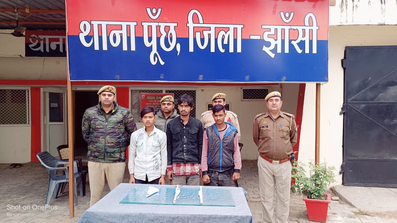झांसी। अपराध और अपराधियों के खिलाफ चलाए जा रहे अभियान के तहत मऊरानीपुर थाना पुलिस ने गत दिवस बलात्कार पीड़िता के चाचा का अपहरण करने वाले आरोपी को दबोच लिया। वही पूछ थाना पुलिस ने तीन शातिर बदमाशों को गिरफ्तार कर लिया।जानकारी के मुताबिक एसएसपी राजेश एस के निर्देशन में चलाए जा रहे अपराध और अपराधियों के खिलाफ अभियान के तहत मऊरानीपुर थाना पुलिस ने ग्राम कुरेंचा निवासी मोहम्मद मुकीन को गिरफ्तार कर लिया। पकड़ा गया आरोपी गत दिवस दलित का अपहरण करने के आरोप में वांछित था। पुलिस के मुताबिक एक पीड़िता ने दो वर्ष पूर्व आरोपी के खिलाफ बलात्कार का मामला दर्ज कराया था। यह मामला न्यायालय में चल रहा है। इस मुकदमे में गवाही देने पर आरोपी ने एक बार पहले भी पीड़िता के घर मारपीट की थी। गत रोज भी आरोपी मुकदमे में राजीनामा कराने का दबाव बनाते हुए पीड़िता के चाचा का अपहरण कर ले गया था। किसी प्रकार चाचा उसके चंगुल से छूट कर भाग निकला और पुलिस के पास पहुंच कर रिपोर्ट दर्ज कराई। पुलिस ने मुकदमा दर्ज कर आज आरोपी को गिरफ्तार कर लिया। उसके कब्जे से एक हथौड़ा और घटना में प्रयुक्त बाइक बरामद की गई है।वही पूछ थाना पुलिस ने देर रात ग्राम सेसा में लूट चोरी की घटनाओं की रोकथाम के लिए अपराधियों की धरपकड़ में लगी थी। तभी तीन संदिग्ध युवक दिखाई दिए। जिनकी तलाशी ली गई तो उनके कब्जे से एक 315 बोर का तमंचा एक कारतूस और चाबी का गुच्छा बरामद हुआ। पकड़े गए तीनों ने अपने नाम जिला कानपुर के अकबर पुर निवासी फैजान, सिकंदर और सरफराज बताए। पुलिस ने तीनों के खिलाफ मामला दर्ज कर जेल भेज दिया है।