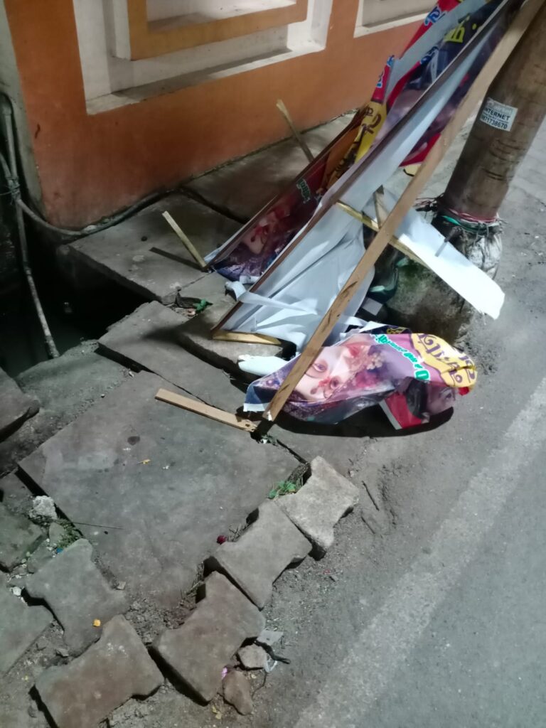 झांसी। नवरात्रि उत्सव पर शांति प्रिय माहौल को खराब करने के उद्देश्य से मां दुर्गा की होर्डिंग साजिश के तहत फ़ाड़ कर नालियों में फेंक दी। जिससे क्षेत्रवासियो में आक्रोश है। उनका आरोप है की क्षेत्रीय पार्षद का व्यवहार ठीक नही है। उसने साजिश के तहत होर्डिंग फटवा दी है।जानकारी के मुताबिक सीपरी बाजार थाना क्षेत्र के मसीहा गंज वार्ड नंबर 40 में ताज कंपाउंड के सामने गली में पच्चीस वर्षों से मां दुर्गा की प्रतिमा की नवरात्रि में स्थापित कराई जाती है। नवरात्रि उत्सव को क्षेत्रवासी बड़े धूमधाम से मनाते है। इसी के चलते समिति के लोगों ने पूरे क्षेत्र में मां दुर्गा की होर्डिंग लगवाई है। क्षेत्रवासियों का आरोप है की क्षेत्रीय पार्षद का क्षेत्रवासियो से व्यवहार ठीक नही है। इसलिए उन्हे कोई मां की आरती में नही बुलाता। इसी खुन्नस के चलते पार्षद ने नगर निगम के कर्मचारियों को बुलाकर मां दुर्गा की पोस्टर बैनर फटता कर नालियों में डलवा दिए। इस घटना से क्षेत्रवासियो में आक्रोश है। उन्होंने नगर निगम सहित जिला प्रशासन से कार्यवाही की मांग की है।