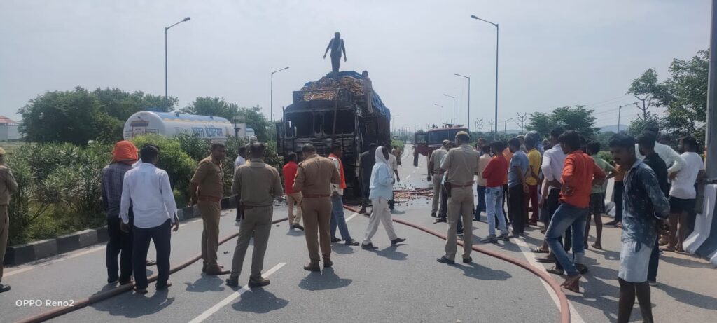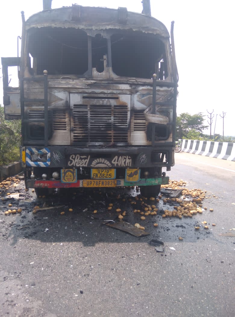 झांसी। कानपुर हाईवे मार्ग पर शनिवार की सुबह आलू से भरे ट्रक ने बाइक सवार को रौंद डाला था। जिससे युवक की मौके पर दर्दनाक मौत हो गई थी। इससे आक्रोश में आए लोगों ने ट्रक में आग लगा दी। आग लगते देख चालक भाग निकला। सूचना पर पहुंची पुलिस ओर फायर बिग्रेड ने किसी प्रकार आग पर काबू पाया। फिलहाल मृतक युवक के दो साथी गंभीर घायल है।जानकारी के मुताबिक ग्राम पिछोर निवासी हेमंत अहिरवार भोजला में नौकरी करता है। प्रतिदिन की तरह वह शनिवार की सुबह अपनी बाइक से ड्यूटी पर जा रहा था। उसके साथ बाइक पर पीछे उसके दो साथी बैठे हुए थे। जैसे वह बाइक लेकर भोजला की ओर हाईवे रोड से सर्विस रोड पर उतर रहे थे। तभी पीछे से तेज रफ्तार में आलू से भरा ट्रक ने उनकी बाइक में टक्कर मार दी और भागने लगा। टक्कर लगने से हेमंत ओर उसके साथी जमीन पर गिर गए और ट्रक भागने हुए हेमंत को रौंदता चला गया। जिससे हेमंत की मौके पर मौत हो गई उसके दो साथी घायल हो गए। इधर अक्रोशित लोगो ने भाग रहे ट्रक को रोक कर उसमे आग लगा दी। सूचना पर पहुंची पुलिस फायर बिग्रेड ने आग बुझा कर स्थिति को काबू में किया।