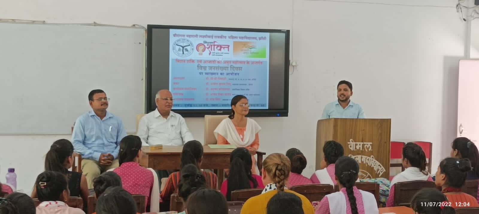 झांसी। वीरांगना महारानी लक्ष्मीबाई राजकीय महिला महाविद्यालय परिसर में मिशन शक्ति एवं आजादी का अमृत महोत्सव के अंतर्गत विश्व जनसंख्या दिवस के उपलक्ष्य में जागरूकता अभियान का कार्यक्रम आयोजित किया गया। कार्यक्रम का शुभारंभ मां सरस्वती के चित्र पर पुष्पांजलि अर्पित करते हुए हुआ। इस कार्यक्रम की अध्यक्षता महाविद्यालय के प्राचार्य डॉ. बी. बी. त्रिपाठी जी ने किया । उन्होंने जनसंख्या वृद्धि के दुष्प्रभाव पर प्रकाश डाला। कार्यक्रम के वक्ता हिंदी विभाग के सहायक प्राध्यापक डॉ. अजीत कुमार सिंह ने वर्ल्ड मीटर (www.worldometers.info) द्वारा विश्व एवं भारत की जनसंख्या वृद्धि के आंकड़े प्रस्तुत किए तथा 2011 से 2022 की अनुमानित जनसंख्या की तुलना करते हुए चुनौती एवं समाधान पर अपनी बात रखी। मिशन शक्ति की कार्यक्रम संयोजिका डॉ. अनुभा श्रीवास्तव ने बढ़ती जनसंख्या और स्त्रियों के लिए बढ़ती चुनौती विषय पर अपने विचार व्यक्त किए। कार्यक्रम का संचालन संगीत विभाग के विभागाध्यक्ष डॉ. दीप सिंह द्वारा किया गया उन्होंने अपने संचालन के मध्य जनसंख्या नियंत्रण पर कई गीत गाए । कार्यक्रम के अंत में आजादी का अमृत महोत्सव कार्यक्रम के संयोजक डॉ अजय शंकर यादव जी ने सभी का धन्यवाद ज्ञापन किया । इस कार्यक्रम में महाविद्यालय के समस्त प्राध्यापकगण, कर्मचारीगण एवं छात्राएं उपस्थित रहे।
