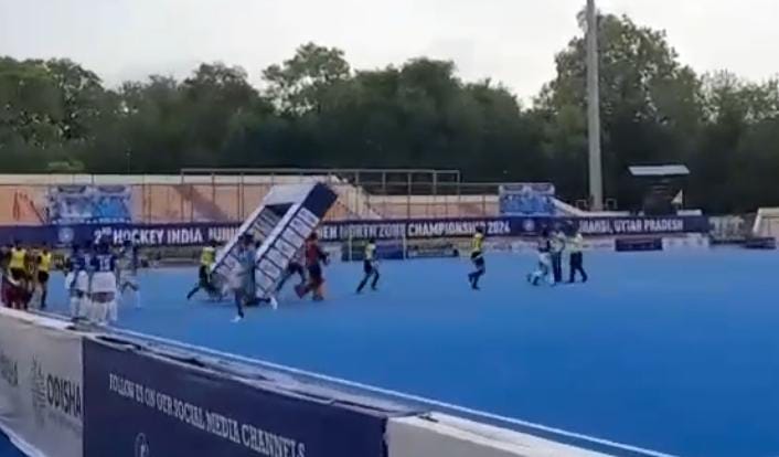 झांसी। हॉकी टूर्नामेंट का शुभारंभ होने से पूर्व ही जब खिलाड़ी मैदान पर पहुंचे उसी दौरान स्वागत द्वार एक खिलाड़ी पर जा गिरा। स्वागत द्वार गिरने से अफरा तफरी का माहौल बन गया। फिलहाल मौके पर मोजूद खिलाड़ी साथियों ने उसे बचा लिया। इस घटना का वीडियो शोशल मीडिया पर जमकर वायरल हो रहा है।जानकारी के मुताबिक ध्यानचंद स्टेडियम में हॉकी टूर्नामेंट का शुभरंभ होना है। आज शुभारंभ के पूर्व ही जम्मू कश्मीर की टीम के गोल कीपर के ऊपर मैदान में स्वागत द्वार गिर गया। खिलाड़ी उसके नीचे दब गया। जनिमत रही साथी खलाडियो ने किसी प्रकार उस खिलाड़ी को बचा लिया। इस घटना का वीडियो शोशल मीडिया पर जमकर वायरल हो रहा साथ ही इससे सुरक्षा व्यवस्था और कार्यक्रम के बंदोबस्त पर भी सवालिया निशान खड़ा हो गया है।