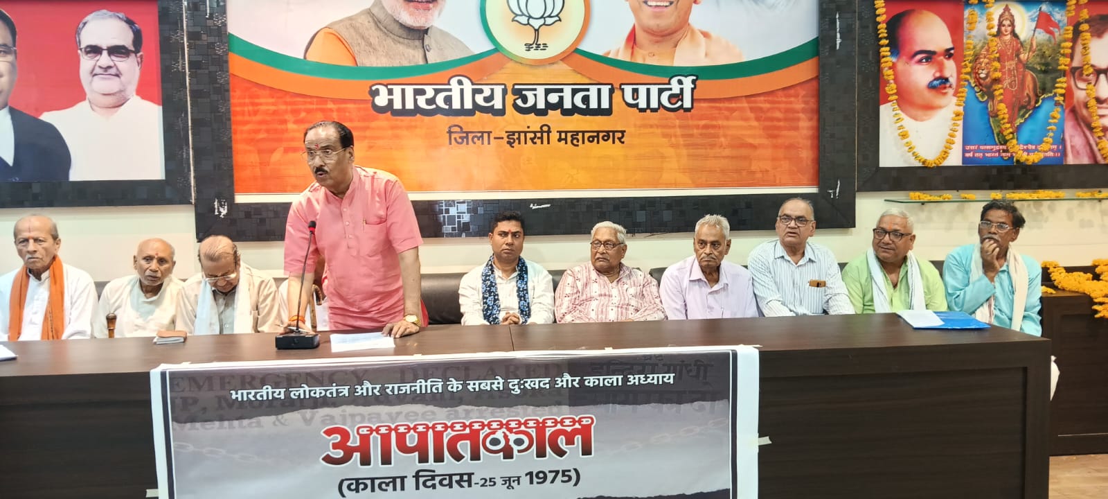 झांसी। देश भर में भारतीय जनता पार्टी (भाजपा) मंगलवार को आपातकाल को काला दिवस के रूप में मना रही है। दिल्ली और उत्तर प्रदेश सहित सभी भाजपा कार्यालयों में होर्डिंग पोस्टर बैनर लगा दिए है। भाजपा के राष्ट्रीय नेतृत्व के आव्हान पर जनपद झांसी में भारतीय जनता पार्टी ने मंगलवार को भाजपा के महानगर कार्यालय में 25 जून 1975 को देश भर लागू हुई आपातकाल को काला दिवस के रूप में मना रहे है। इस दौरान पूर्व मंत्री रविंद्र शुक्ला के नेतृव में आयोजित किए गए काला दिवस कार्यक्रम में शहर भर के स्वतंत्रता संग्राम सेनानी और आपात काल सेनानियों को आमंत्रित कर उनका स्वागत सम्मान किया गया। इस दौरान पूर्व मंत्री ने कहा कि ’25 जून 1975 लोकतंत्र का काला दिवस, कभी न भूलने वाला आपातकाल’ है। भाजपा ने अपने एक्स अकाउंट पर एक पोस्टर भी शेयर किया, जिस पर लिखा है कांग्रेस की काली करतूत व लोकतंत्र के सबसे काले अध्याय 25 जून 1975 आपातकाल के विरोध में उठ रहे हर स्वर का हृदय से वंदन। इस दौरान झांसी नगर पालिका पूर्व चेयर मैन डॉक्टर धन्नू लाल गौतम, भाजपा महानगर अध्यक्ष हेमन्त परिहार सहित कई भाजपा नेता और कार्यकर्ता मौजूद रहे।