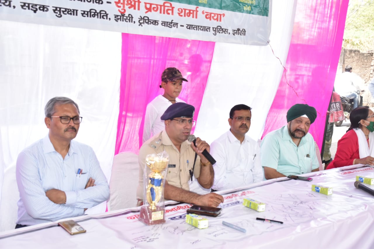 झांसी। सड़क सुरक्षा अभियान के तहत यातयात नियमों का पालन कराने के लिए दिलाई गई शपथ। वरिष्ठ पुलिस अधीक्षक झाँसी शिवहरी मीना के कुशल निर्देशन में जनपद में चलाये जा रहे सड़क सुरक्षा जागरूकता हस्ताक्षर अभियान के तहत आमजन को यातायात नियमों के प्रति जागरूक किया जा रहा है तथा यातायात नियमों का उल्लंघन करने वाले वाहन चालकों के विरुद्ध नियमानुसार कार्यवाही की जा रही है । जिसका उद्देश्य सड़क दुर्घटना में होने वाली मौतों को कम करना है । को मुख्य अतिथि वरिष्ठ पुलिस अधीक्षक के नेतृत्व में रसबहार तिराहे पर जागरूकता हस्ताक्षर अभियान के तहत भव्य कार्यक्रम का आयोजन किया गया । कार्यक्रम में बच्चों द्वारा नुक्कड़ नाटक कर जागरूक किया गया तथा लोगों को यातायात नियमों के पम्पलेट, स्टीकर, बैनर आदि वितरित किये गये । कार्यक्रम में मौजूद सभी लोगों को यातायात नियमों के पालन करने की शपथ दिलाकर नियमों के पालन करने की अपील की गयी। उक्त यातायात जागरूकता हस्ताक्षर अभियान कार्यक्रमों के दौरान संभागीय परिवहन अधिकारी प्रवर्तन (RTO) सुभाष पाण्डेय, संभागीय परिवहन अधिकारी शासन (RTO) आर.आर. सोनी, उप संभागीय परिवहन अधिकारी (ARTO) सतेन्द्र कुमार, यातायात निरीक्षक शैलेन्द्र सिंह एवं अन्य अधिकारी कर्मचारीगण, चीफ ट्रफिक वार्डन शिव प्रसाद तिवारी एवं अन्य सहयोगी, स्कूली बच्चे, अभिभावक, ऑटो चालक, काफी संख्या में आमजन मौजूद रहे ।