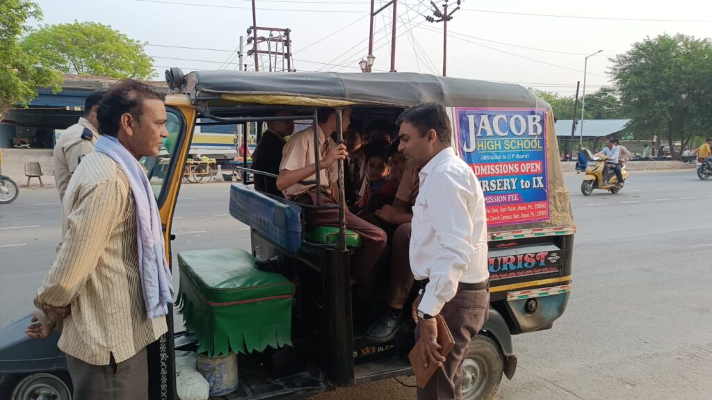 झांसी। मण्डलायुक्त, झाँसी मण्डल, झाँसी तथा जिलाधिकारी , झाँसी के द्वारा दिये गये निर्देशों तथा आई०टी०एम०एस० नगर निगम के द्वारा उपलब्ध करायी गयी सूची जिसमे जनपद / शहर में ऐसे वाहन जिनकी फिटनिस, परमिट, कर आदि समाप्त है, के विरुद्ध आज दिनांक 16.03.2023 को सहायक संभागीय परिवहन अधिकारी (प्रवर्तन), प्रथम झाँसी, हेमचन्द्र सिंह गौतम, सहायक संभागीय परिवहन अधिकारी (प्रवर्तन), द्वितीय झाँसी, सुरेन्द्र कुमार अग्रवाल तथा यातायात पुलिस, झाँसी के सहयोग से शहर के विभिन्न चौराहों पर प्रवर्तन कार्यवाही का सघन अभियान चलाया गया। इस अभियान के तहत 28 टैम्पो / टैक्सी तथा अन्य वाहन जिनकी फिटनिस, परमिट, चालक लाइसेंस आदि समाप्त थे, को विभिन्न थानों (सीपरी बाजार, टी०एस०आई० तथा नबावाद) में निरुद्ध किया गया। साथ ही 38 वाहनों के विभिन्न अभियोगों में चालान किये। साथ ही स्कूली वाहनों के विरुद्ध भी सघन चेकिंग अभियान चलाया गया। मानक के विरुद्ध पाये गये स्कूली वाहन तथा स्कूली छात्र/छात्राओं को ओवरलोडिंग करते हुए पाये गये वाहनों को निरुद्ध / चालान की कार्यवाही की गयी। इस तरह के 02 वाहनों को थाने में निरुद्ध किया गया तथा 06 वाहनों का चालान किया गया।