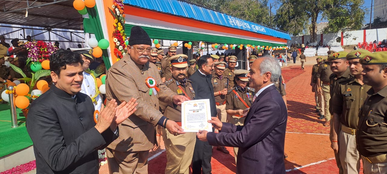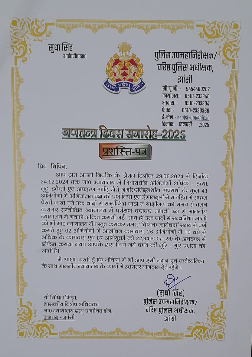 झांसी। अभियोजन की ओर से ठोस पैरवी कर शातिर अपराधियों को अधिक से अधिक सजा कराने वाले विशेष शासकीय अधिवक्ता विपिन कुमार मिश्रा को पुलिस लाइन में गणतंत्र दिवस की परेड के दौरान प्रशस्ति पत्र देकर सम्मानित किया गया। गणतंत्र दिवस पर झांसी पुलिस लाइन में आयोजित ध्वजारोहण ओर परेड सलामी कार्यक्रम के दौरान लूट डकैती के आरोपियों को अभियोजन की ओर से ठोस पैरवी कर अधिक से अधिक सजा दिलाने वाले विशेष शासकीय अधिवक्ता विपिन कुमार मिश्रा को मुख्यातिथि विधान परिषद के उपसभा पति कुंवर मानवेंद्र प्रताप सिंह, जिलाधिकारी झांसी अविनाश कुमार, एसएसपी/डीआईजी श्रीमती सुधा सिंह, पुलिस उपमहानिरीक्षक झांसी परिक्षेत्र झांसी केशव कुमार ने प्रशस्ति पत्र देकर सम्मानित किया। आपको बता दे कि विशेष शासकीय अधिवक्ता विपिन कुमार मिश्रा कई बार सम्मानित हो चुके है।