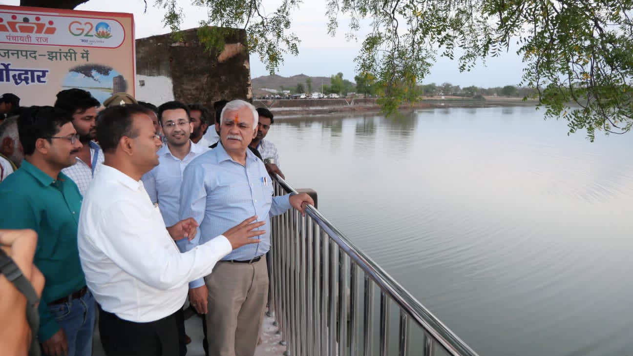 झांसी। प्रदेश सरकार के मुख्य सचिव दुर्गाशंकर मिश्र ने लहर ठकुरपुरा गाँव के चन्देल कालीन तालाब के जीर्णोद्धार कार्य का निरीक्षण किया। उन्होंने बबीना हाइवे के पास पाइप पेयजल योजना के अंतर्गत टहल कम्पनी द्वारा बनाये जा रहे अमृत प्रोजेक्ट फेज-2 का भी निरीक्षण किया। निरीक्षण शिवपुर उन्होंने बरुआसागर किला का भी निरीक्षण किया और पर्यटक स्थल के रूप में विकसित करने के निर्देश दिए। उत्तर प्रदेश सरकार के मुख्य सचिव दुर्गाशंकर मिश्र विकास खण्ड बबीना के लहर ठकुरपुरा गाँव पहुँचे, जहाँ पर ग्राम प्रधान राजेश्वरी देवी, आजाद सिंह यादव व जल सहेलियों ने पुष्पगुच्छ भेंटकर उनका स्वागत किया। इस अवसर पर ग्रामीणों ने बुन्देलखण्ड का प्रसिद्ध मोनिया नृत्य प्रस्तुत किया, मोनिया नृत्य देखकर मुख्य सचिव ने ताली बजाकर कलाकारों का उत्साहवर्धन किया। मुख्य सचिव ने मनरेगा व क्षेत्र पंचायत द्वारा चन्देल कालीन तालाब के जीर्णोद्धार कार्य का निरीक्षण किया। उन्होंने तालाब की जलकुम्भी हटाने के लिये जल सहेलियों व परमार्थ समाजसेवी संस्थान सहित जिला प्रशासन की प्रशंसा की। मुख्य सचिव ने तालाब को पर्यटन स्थल के रूप में विकसित करने का सुझाव दिया उन्होंने मौके पर ग्रामीणों द्वारा तालाब के सौंदर्यीकरण के अंतर्गत बाउंड्री वॉल एवं विद्युत व्यवस्था को उपलब्ध कराने के निर्देश दिए। निरीक्षण के अवसर उन्होंने वृक्षारोपण किया। लहरठकुरपुरा गांव के तालाब के निरीक्षण के दौरान जिलाधिकारी रविन्द्र कुमार ने जानकारी देते हुये बताया कि तालाब चंदेल कालीन युग का एक बेमिसाल तालाब है परंतु अपना अस्तित्व लगभग होने की कगार पर था जिसे मनरेगा ग्राम निधि एवं व्यापक जन सहयोग से पुनर्जीवित किया गया है। परमार्थ समाज सेवी संस्थान की जल सहेलियों द्वारा भी इस पुनीत कार्य में अपना योगदान दिया गया। उन्होंने बताया कि ग्राम लहार में लगभग 1000 वर्ष पुराना चंदेल कालीन तालाब है जिससे आस पास के गाँवों की लगभग 350 किसानों के खेतों की सिंचाई होती है।यह तालाब लगभग 82 एकड़ में फैला हुआ है। इस तालाब में ग्राम पंचायत सुकवां, रसीना, गणेशपुरा, लहर ठकुरपुरा एवं सिमिरिया में बरसात का पानी आता है। जिलाधिकारी रविंद्र कुमार ने उक्त तालाब के जीर्णोद्धार एवं पुनर्जीवित करने के लिए पूरे तालाब में फैली जलकुम्भी को जन भागीदारी एवं पाइपकल्वर्ट के माध्यम से जल प्रवाह के द्वारा बाहर निकालने का कार्य किया है जिससे तालाब में पानी साफ हो गया है। जलकुम्भी हटाने से तालाब की मछलियों को नया जीवन मिला है जिससे मछली पालन की सम्भानायें बढ़ गई, राजकुमार जो क्षेत्रीय लोगों को आय का जरिया बनेगा। तालाब में जलकुम्भी की सफाई होने से आस पास के गांवों के जानवरों को पी