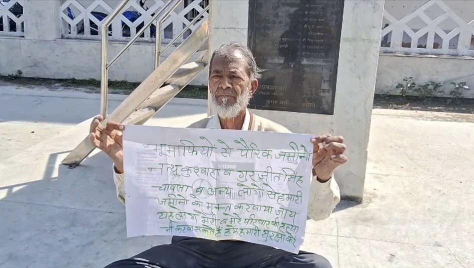 झांसी। दबंग भू माफियाओं पर जमीन पर अवैध कब्जा करने का आरोप लगाकर कब्जा मुक्त कराने की मांग कर रहे वृद्ध ने हाथ में पोस्टर बैनर लेकर धरना प्रदर्शन शुरू कर दिया है। बुधवार को कचहरी स्थित गांधी उद्यान पार्क में हाथ में पोस्टर बैनर लेकर धरने पर बैठे वृद्ध प्रेमनगर क्षेत्र के नूर नगर निवासी हबीबुर्रहमान ने बताया कि उसकी पुस्तैनी जमीन पंचवटी कॉलोनी ओर दुल्हा सैयद बाबा मजार के पास पड़ी है। जिस पर कई वर्ष से दबंग भू माफियाओं ने प्लाटिंग कर बेच दी। उसका आरोप है कि वह कई बार शिकायत कर चुका है। कार्यवाही नहीं हुई। उसका कहना है जब तब उसकी जमीन कब्जा मुक्त नहीं हो जाती वह धरना प्रदर्शन जारी रखेगा।