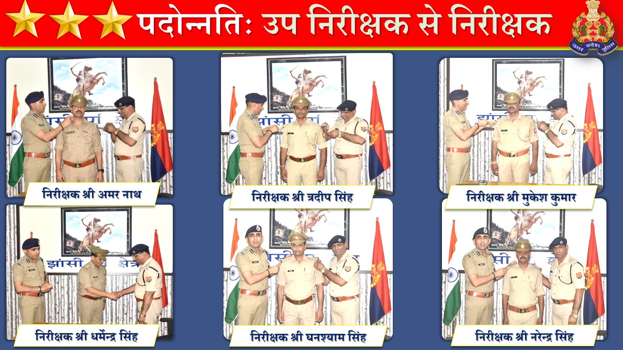 झांसी। जिले में तैनात छह दारोगाओ का प्रमोशन होने पर मंगलवार को डीआईजी और एसएसपी ने उनके कंधों पर तीन स्टार लगाकर उन्हें बधाई शुभकामनाएं दी। जनपद में तैनात 06 उपनिरीक्षक क्रमशः थाना प्रभारी लहचूरा अमरनाथ, थाना प्रभारी एरच त्रदीप सिंह, थाना प्रभारी शाहजहाँपुर धर्मेन्द्र सिंह चौहान, उ0नि0 घनश्याम सिंह थाना कटेरा, उ0नि0 नरेन्द्र सिंह थाना सकरार तथा थाना नवाबाद पर तैनात उ0नि0 श्री मुकेश कुमार सिंह का उप निरीक्षक से निरीक्षक के पद पर पदोन्नति हुई है। पुलिस उपमहानिरीक्षक झाँसी परिक्षेत्र झाँसी जोगेन्द्र कुमार व वरिष्ठ पुलिस अधीक्षक झाँसी शिवहरी मीना द्वारा उक्त उ0नि0 गण को स्टार लगाकर शुभकामनाएँ दी गयीं तथा उनको अपनी दोगुनी ऊर्जा से पूर्ण निष्ठा एवं ईमानदारी के साथ अपने कार्यों को करने हेतु प्रेरित किया गया।