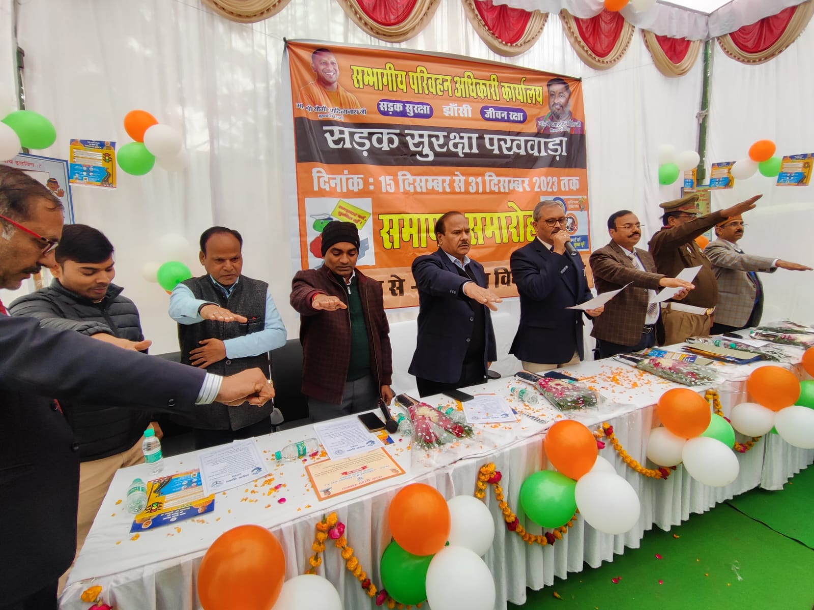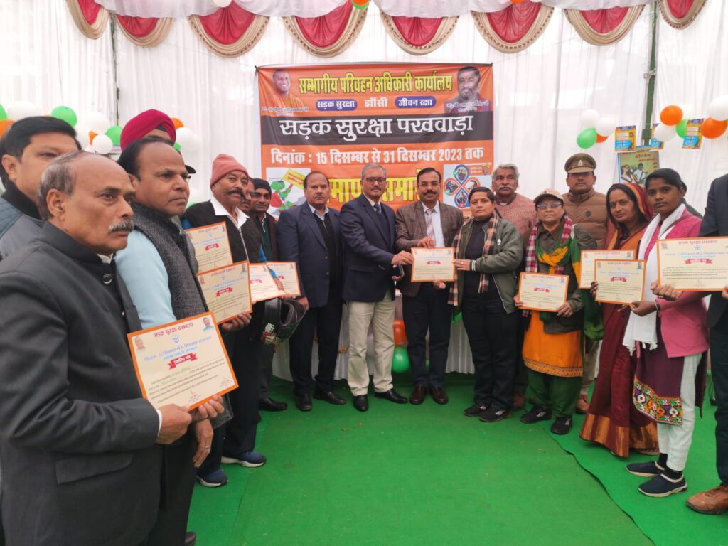 झांसी। परिवहन विभाग, झाँसी द्वारा दिनांक 15 से 31दिसंबर तक आयोजित सड़क सुरक्षा पखवाड़ा के अन्तर्गत आज दिनांक 31.07.2023 को परिवहन विभाग द्वारा सडक सुरक्षा, पखवाडा का समापन समारोह की गोष्ठी की गयी। इस अवसर पर उपनिदेशक अर्थ एंव संख्या एस एन त्रिपाठी, संभागीय परिवहन अधिकारी (प्रवर्तन) प्रमात पाण्डेय, जिला विद्यालय निरीक्षक राजेश कुमार सिह, यातायात निरीक्षक उपाकान्त ओझा, यात्री / मालकर अधिकारी सुरेन्द्र कुमार अग्रवाल, ए०आर०एम० श्री डी०एन० श्रीवास्तव, संभागीय निरीक्षक (प्रावि०) संजय सिंह यातायात उपनिरीक्षक प्रेमपाल सिंह एवं चीफ टैफिक वार्डन शिव प्रसाद तिवारी, श्रीमती दीपशिखा शर्मा, सुश्री प्रगति शर्मा, श्रीमती नीलम शर्मा, बस यूनियन से अनूप यादव (अध्यक्ष), जावेद (महासचिव), ट्रक यूनियन से गुरदीप चावला हैप्पी (अध्यक्ष), टैम्पों यूनियन से मंसूर अहमद मंसूरी व ई-रिक्शा चालक आदि उपस्थित रहे। कार्यक्रम का संचालन यात्री / मालकर अधिकारी दीपक सिंह द्वारा किया गया। कार्यक्रम में सभी को सड़क सुरक्षा के प्रति जागरुक किया गया। साथ ही शीत ऋतु मे होने वाले कोहरे में वाहन को कम गति में चालाने हेतु जागरुक किया गया। दोपहिया वाहन चालकों को हेल्मेट व चार पहिया वाहन चालको को सीटबेल्ट लगाकर ही वाहन चलाने हेतु जागरुक किया गया व सड़क पर हो रही दुर्घटनाओं को रोकने हेतु यातायात नियमों के तहत वाहन चलाने पर विशेष जोर दिया गया। कार्यक्रम में सडक सुरक्षा से संबंधित विभागों के स्टेक होल्डर एवं एन०जी०ओ०, ट्रैफिक वार्डन, प्रदूषण/ड्राइविंग ट्रेनिंग सेन्टर संचालकों व आटोमोबाइल डीलरों के कार्यकर्ताओं को, प्रशस्ती पत्र वितरित किये गये। श्री सुरेन्द्र कुमार अग्रवाल, यात्री/मालकर अधिकारी ने अंत में सभी का आभार व्यक्त किया एवं आर०टी०ओ० (प्रवर्तन) द्वारा प्रगंण में उपस्थित सभी को सड़क सुरक्षा की शपथ दिलायी गयी।