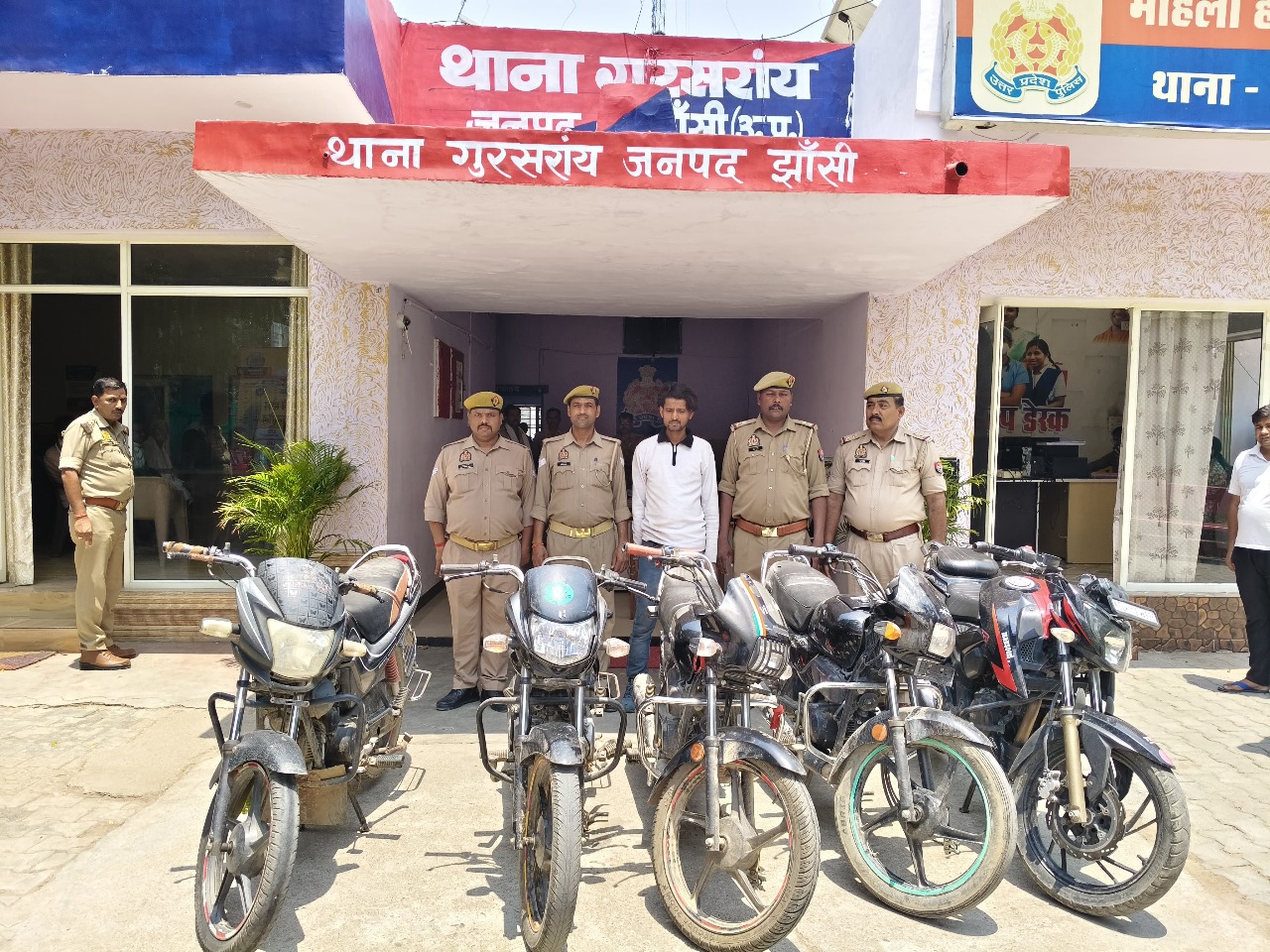 झांसी। गुरसराय थाना पुलिस ने शातिर बदमाश को दबोच कर उसके कब्जे से पांच चोरी की बाइक एक तमंचा दो जिंदा कारतूस बरामद कर लिए। पुलिस ने आरोपी के विरुद्ध अभियोग पंजीकृत कर उसे जेल भेज दिया है। शनिवार को एसएसपी के निर्देशन में अपराध और अपराधियों के खिलाफ अभियान चलाया गया। इसी अभियान के तहत गुरसराय थाना पुलिस ने आज संदिग्ध युवक को गिरफ्तार कर लिया। पूछताछ में संदिग्ध ने अपना नाम उस्मान खान निवासी मगरवारा कटेरा को गिरफ्तार कर लिया। पुलिस ने उसकी तलाशी के दौरान उसके कब्जे से एक तमंचा दो जिंदा कारतूस बरामद करते हुए उससे गहराई से पूछताछ की तो उसने पुलिस को बताया कि वह वाहन चोरी की घटनाओं को अंजाम देता है, पुलिस ने उसके कब्जे से उसकी निशानदेही पर छापेमारी करते हुए पांच चोरी की बाइक बरामद कर ली। बरामद की गई बाइक क्रमांक mp 36 ms 7769, MP36 जेड डी 8356, mp 36 जेड ई 6514, mp 16 md 8729, डी एल 8 scl 5530 बताई गई है।