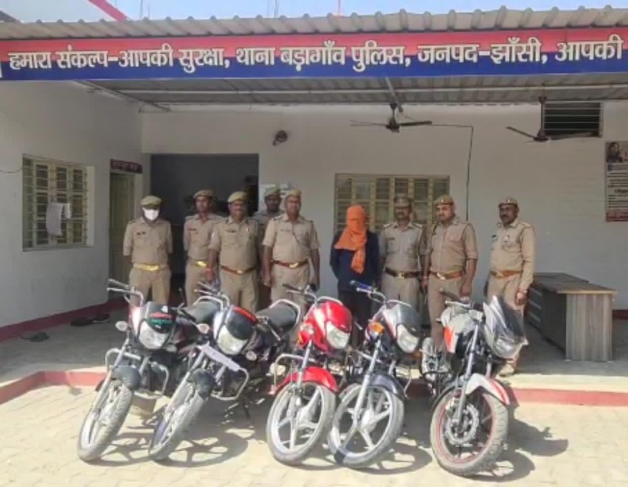 झांसी। बड़ागांव थाना पुलिस ने शातिर चोर को गिरफ्तार कर उसके कब्जे से चोरी की पांच बाइक बरामद कर आरोपी के खिलाफ अभियोग पंजीकृत कर उसे जेल भेज दिया।जानकारी के मुताबिक एसएसपी शिवहरि मीणा के निर्देशन मे चलाए जा रहे अपराधियों के खिलाफ अभियान के तहत बड़ागांव थाना पुलिस वाहन चेकिंग कर रही थी। तभी एक संदिग्ध व्यक्ति पुलिस को देख भागने का प्रयास करने लगा। पुलिस को शक होने पर उसका पीछा करते हुए उसे दबोच लिया। पूछताछ में पकड़े गए संदिग्ध युवक ने अपना नाम बड़ागांव निवासी अंकित वाल्मिक बताया। पुलिस ने उससे गहराई से पूछताछ की तो उसने बाइक चोरी करने का जुर्म कबूल करते हुए बताया की वह और उसका बाइक चोरी कर बेचने का कारोबार करते थे। पुलिस ने उसकी निशानदेही से पांच चोरी की बाइक बरामद कर ली। वही उसके भागे गए दूसरे साथी की तलाश की जा रही है।