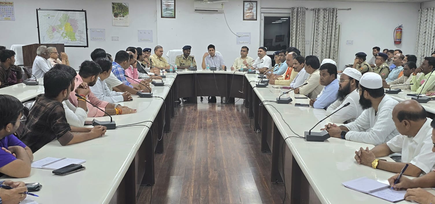 आने वाले त्योहारों की तैयारियां की समीक्षा करते हुए उन्होंने कहा कि अपराध और अपराधियों के प्रति राज्य सरकार की जीरो टॉलरेंस की नीति है। अराजकता व अव्यवस्था फैलाने वाले लोगों पर कार्रवाई की जाए। पर्वाें व त्योहारों की आड़ में अव्यवस्था व अराजकता को किसी भी प्रकार की छूट न मिले समय रहते कार्रवाही हो। क्षेत्र में पुलिस द्वारा फ्लैग मार्च व फुट पेट्रोलिंग की जाए।अभिसूचना से जानकारी प्राप्त होने पर तुरन्त कार्रवाई हो। संवेदनशील स्थानों व जनपदों में पूरी सजगता व सतर्कता बरती जाए। अफवाहों को स्थान न मिले। सोशल मीडिया के प्रति निरन्तर सतर्कता बनी रहे। वरिष्ठ पुलिस अधीक्षक राजेश एस ने गणेश प्रतिमा पंडालों की सुरक्षा के पर्याप्त इंतेजामात सुनिश्चित करने के निर्देश देते हुए कहा कि सभी स्थानों पर पुलिस बल मुस्तैद रहे। विमानों के जुलूस के दौरान तैनात सिपाही संवेदनशील होकर अपनी दायित्वों का निर्वहन करें। बैठक में अध्यक्ष जल विहार समिति मुकेश अग्रवाल ने बताया कि नगर क्षेत्र में19 विमान निकलेंगे। सभी विमान बहुमूल्य आभूषणों से सुसज्जित होंगे, इन्हें पर्याप्त सुरक्षा दी जाए। उन्होंने विसर्जन मार्ग को गड्ढा मुक्त किए जाने का सुझाव दिया। विश्व हिंदू परिषद विनोद अवस्थी ने बैठक में बताया कि नगर क्षेत्र में 5 मुख्य स्थान हैं,जहां गणेश प्रतिमा विर्सर्जन किया जाता है। उन्होंने विसर्जन के दौरान दुर्घटना ना हो उसके लिए पर्याप्त पुलिस व्यवस्था उपलब्ध कराए जाने का सुझाव दिया। बैठक में याकूब अहमद मंसूरी ने बताया कि 16 सितंबर को सुबह 08 बजे नगर के विभिन्न क्षेत्रों में जुलूस निकलेगा। जुलूस के मार्ग को साफ सुधरा किया जाए। शिया धर्म गुरु ने शिया मस्जिद के पास बिजली एवं केबल के तारों को तत्काल ठीक किए जाने का सुझाव दिया, इसके अतिरिक्त उन्होंने क्षेत्र में जलापूर्ति की व्यवस्था को तत्काल सुधारे जाने की माँग की। बैठक में पंडित कैलाश नारायण पाठक, शहर काजी मुफ़्ती साबिर, अतुल अग्रवाल काल्पनिक, पियुष रावत, पंडित वसंत गोलवलकर, पण्डित राजेश बिरथरे, मुफ्ती खालिद अंसारी,पं रवीश त्रिपाठी ने भी अपने विचार प्रस्तुत किए। जिलाधिकारी की अध्यक्षता में आयोजित बैठक में नगर के विभिन्न संप्रदाय के धर्मगुरुओं,सामाजिक संगठन के अतिरिक्त व्यापारिक संगठन के प्रतिनिधियों ने भी प्रतिभाग किया। इस अवसर पर वरिष्ठ पुलिस अधीक्षक राजेश एस, नगर आयुक्त सत्य प्रकाश,जॉइंट मजिस्ट्रेट दीपक सिंघवाल, सीएमओ डाॅ सुधाकर पांडेय,अपर जिलाधिकारी प्रशासन ए के सिंह, पुलिस अधीक्षक नगर ज्ञानेंद्र कुमार सिंह,पुलिस अधीक्षक ग्रामीण गोपीनाथ सोनी, नगर मजिस्ट्रेट विधेश कुमार सहित नगर क्षेत्र के क्षेत्राधिकारी पुलिस व लोक निर्म