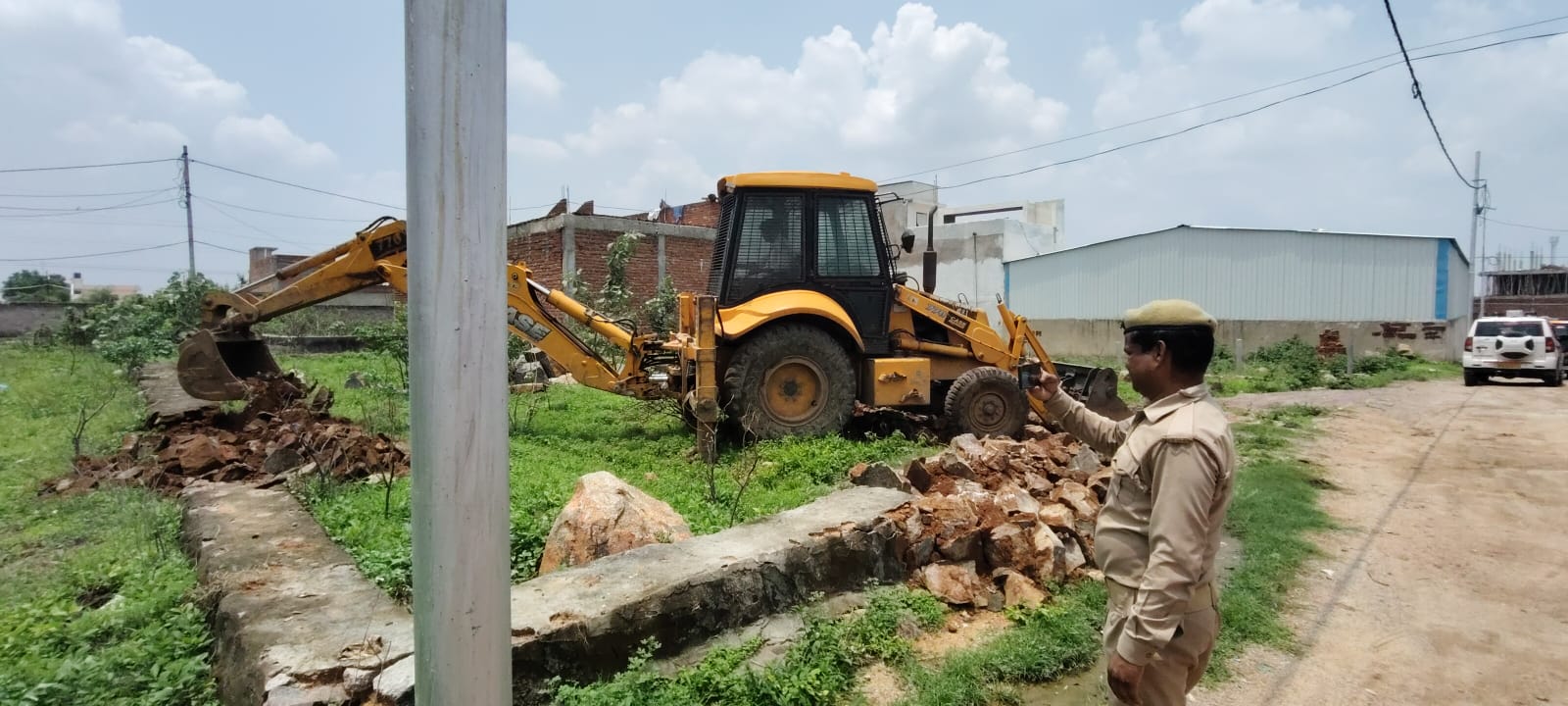 झांसी। झांसी नगर निगम क्षेत्र के वार्ड नं 22 बिजौली में दोपहर अपर नगर आयुक्त के नेतृत्व में भारी पुलिस बल के साथ बुलडोजर पहुंचा और अवैध निर्माण को गिराकर सरकारी भूमि को कब्जा मुक्त कराया गया नगर निगम प्रशासन द्वारा अवैध निर्माण पर बुलडोजर चलता देख लोगों में हड़कंप मच गया भारी पुलिस बल देख किसी की भी विरोध करने की हिम्मत नहीं पड़ी नगर निगम प्रशासन ने अवैध निर्माण के रुप में निर्मित मकानों के फाउंडेशन तोड़ कर भूमि को समतल कर दिया।ललितपुर राजमार्ग पर बिजौली में मंगलवार में दोपहर के समय नगर निगम की टीम के साथ अपर नगर मजिस्ट्रेट सहित पुलिस के लाव-लश्कर को देखकर लोगों में हड़कंप मच गया अधिकारीयों का काफिला बुलडोजर लेकर सीधे राम राजा मैरिज गार्डन के निकट टी वी एस गोदाम के पास ठहर गया तो आसपास रहने वाले लोगों की सांसें तेज हो गई लोग समझ नहीं पा रहे थे कि आखिर माजरा क्या है इसी बीच जिला प्रशासन की तरफ से गौरव आर्या / एसीएम,रोली गुप्ता अपर नगर आयुक्त के निर्देश पर बुलडोजर ने टी वी एस गोदाम के बगल में निर्मित मकानों के फाउंडेशन तोड़ना शुरू किए तो लोगों की भारी भीड़ जमा हो गई मामले की गंभीरता को देखते हुए नगर निगम प्रशासन थाना प्रेम नगर, क्षेत्र की पुलिस को सूचना दी गई जिसके बाद थाना प्रेम नगर प्रभारी शिव कुमार सिंह राठौर बिजौली पुलिस वल के साथ मौके पर पहुंचे इसी बीच मामले की गंभीरता को देखते हुए बड़ागांव पुलिस को भी मौके पर बुला लिया गया अपर नगर आयुक्त रोली गुप्ता ने बताया कि बिजौली मौजा में गाटा संख्या 1256 में नगर निगम प्रशासन की सरकारी भूमि हैं जिस पर भूमि माफियाओं ने कब्जा कर निर्माण शुरू कर दिया गया है जिसकी शिकायत मिलने पर नगर निगम प्रशासन द्वारा लेखपाल से नाप कराई तो लगभग 0.565 हेक्टेयर भूमि पर कब्जा पाया गया जिसको तोड़कर भूमि को कब्ज़ा मुक्त कराया गया है इस मौके पर एसडीएम जिला प्रशासन गौरव आर्या,अपर नगर आयुक्त रोली गुप्ता, लेखपाल राजीव राजपूत समेत थाना प्रेम नगर एस ओ शिवकुमार सिंह राठौर, बड़ागांव थानाध्यक्ष अनुज सिंह गंगवार, बिजौली पुलिस चौकी प्रभारी विनीत कुमार, बिजौली हल्का इंचार्ज वीरेंद्र सिंह समेत भारी पुलिस बल तैनात रहा।