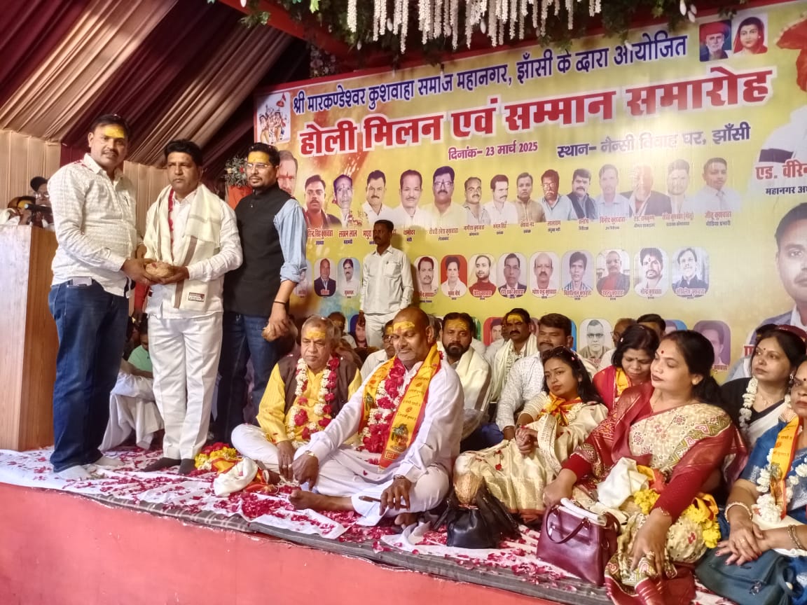 झांसी। समाज के लिए हमेशा तात्पर्य रहना ओर समाज के हित में हमेशा कार्य करना इसी प्राथमिकता के साथ हम समाज के लिए कार्य कर रहे है और करते रहेंगे। यह कहना मारकंडेश्वर कुशवाह समाज के कार्यवाहक अध्यक्ष एडवोकेट सुरेश कुशवाह कई। रविवार को मंडी रोड स्थित नैंसी गार्डन में श्री मारकंडेश्वर कुशवाह समाज के तत्वावधान में कार्यवाहक अध्यक्ष एडवोकेट सुरेश कुशवाह के नेतृत्व में होली मिलन समारोह ओर माते मुखिया का सम्मान समारोह का आयोजन किया गया। इस दौरान कार्यक्रम के अतिथि जुगल किशोर कुशवाह, दयाराम कुशवाह पप्पू भैया, काली चरण कुशवाह, सीताराम कुशवाह,लखन पार्षद, दीप माला कुशवाह, प्रेमवती कुशवाह, सीताराम कुशवाह, देवी सिंह कुशवाह, दयाराम मुखिया आदि का हार माला पहना कर स्वागत किया गया। इस दौरान कार्यवाहक अध्यक्ष एडवोकेट सुरेश कुशवाह ने बताया कि वह समाज को एक साथ चलने के लिए यह कार्यक्रम आयोजित कर रहे ओर उन्होंने कहा कि वह समाज के लिए तन मन धन से हमेशा समर्पित रहेंगे। इसके उपरांत होली की फाग, राई नृत्य, आदि आयोजन हुए। तत्पश्चात माते मुखिया का हार माला पहना कर ओर प्रशस्ति पत्र शॉल श्रीफल भेंट कर सम्मान किया गया। कार्यक्रम का संचालन रमेश चंद्र कुशवाह ओर आभार डॉक्टर मंगल कुशवाह ने व्यक्त किया।