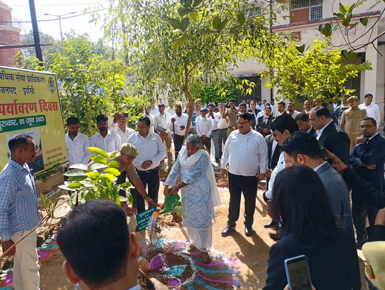 झांसी। आज विश्व पर्यावरण के अवसर पर जनपद न्यायालय परिसर ए०डी०आर० भवन प्रागंण में जनपद न्यायाधीश झांसी श्रीमती कमलेश कच्छल द्वारा वृक्षारोपण किया गया एवं न्यायालय परिसर में स्वच्छता अभियान भी आयोजित किया गया। वृक्षारोपण उपरान्त जनपद न्यायाधीश एवं उपस्थित समस्त न्यायिक अधिकारीगण द्वारा पर्यावरण के बचाव हेतु शपथ दिलाई। कार्याक्रम के अन्त में अपर जिला जज/सचिव, जिला विधिक सेवा प्राधिकरण शरद कुमार चौधरी द्वारा सभी के प्रति आभार व्यक्त किया गया। कार्याक्रम का सफलतापूर्वक संचालन वरिष्ठ लिपिक, जिला विधिक सेवा प्राधिकरण आदिल जाफरी द्वारा किया गया। इस अवसर पर प्रधान न्यायाधीश पारिवारिक न्यायालय विजय शंकर उपाध्याय, अपर जिला एवं सत्र न्यायाधीश, न्यायालय संख्या-01 सुनील कुमार यादव, विशेष न्यायाधीश (एससी०/एसटी० एक्ट) आदित्य चतुर्वेदी, अपर जिला एवं सत्र न्यायाधीश / एफ०टी०सी० (ओ०ए०डब्लू०) श्री जितेन्द्र यादव, अपर जिला एवं सत्र न्यायाधीश, न्यायालय संख्या-02 कमल कांत श्रीवास्तव, अपर मुख्य न्यायिक मजिस्ट्रेट, रेलवे अरूण कान्ति यशोदास, सिविल जज जू०डि०/एफ०टी०सी० (एफ०सी०) सुश्री खुशबु धनकर, अध्यक्ष स्थायी लोक अदालत विशेष शर्मा, चीफ, लीगल एड डिफेन्स काउन्सिल प्रतीक समाधिया, डिप्टी, लीगल एड डिफेन्स काउन्सिल अजितेन्द्र तिवारी सहित न्यायालय के कर्मचारीगण, पराविधिक स्वंय सेवकगण (पी०एल०वी०) उपस्थित रहे।