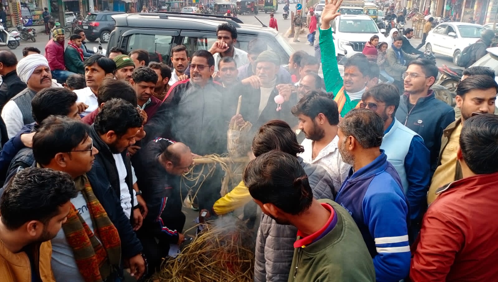 झांसी। परम पूज्य श्री बागेश्वर धाम सरकार महाराज जी के समर्थन में रविवार को झांसी महानगर के ह्रदय स्थली इलाइट चौराहे पर शांतिपूर्वक विरोध प्रदर्शन किया गया। सरकार के समर्थन में उमड़े जनसैलाब ने श्याम मानव का पुतला दहन भी किया। सभी भक्तों ने श्री बागेश्वर धाम के समर्थन में जोरदार जयकारे भी लगाए। इस प्रदर्शन को कई हिंदूवादी संगठनों ने अपना समर्थन देते हुए विरोध के दौरान अपनी उपस्थिति उपस्थिति दर्ज कराई। मध्य प्रदेश के छतरपुर जिले के ग्राम गढ़ा में स्थित “बागेश्वर धाम”, जो स्वंयभू हनुमान जी की दिव्यता के लिए देश – विदेश में प्रसिद्ध है। कई तपस्वियों की दिव्य भूमि है बागेश्वर धाम, जहां लोगों को बालाजी महाराज की कृपा और आशीर्वाद दर्शन मात्र से ही मिल जाते हैं। यहां बालाजी महाराज एक अर्जी के माध्यम से सुनते हैं आपकी समस्या और धाम के पीठाधीश्वर पूज्य धीरेन्द्र कृष्ण शास्त्री जी महाराज, जिसे दुनिया बागेश्वर धाम सरकार के नाम से संबोधित करती है, के माध्यम से समाधान करवाते हैं।लेकिन पिछले कुछ दिनों से लगातार विश्व विख्यात परम पूज्य श्री बागेश्वर धाम सरकार को कुछ हिंदू धर्म विरोधी शक्तियों द्वारा बदनाम करने का प्रयास किया जा रहा है। सरकार के बारे में गलत टिप्पणियों की जा रही है। उनकी भक्ति और शक्ति को बेवजह चैलेंज किया जा रहा है। इस कारण परम पूज्य सरकार के सभी देसी विदेशी भक्तों में रोष का माहौल व्याप्त है। रविवार को झांसी शिष्य मंडल के सभी सदस्यों ने इलाइट चौराहे पर सरकार के समर्थन में शांतिपूर्ण तरीके से विरोध प्रदर्शन किया। तो वही श्री बागेश्वर धाम सरकार के समर्थन में उमड़े जनसैलाब ने श्याम मानव का पुतला भी दहन किया। इस प्रदर्शन को कई हिंदूवादी संगठनों ने अपना समर्थन देते हुए विरोध के दौरान अपनी उपस्थिति उपस्थिति दर्ज कराई।