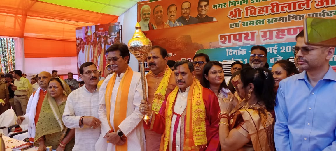 शपथ ग्रहण समारोह के मुख्यातिथि डॉक्टर आदर्श सिंह मंडलायुक्त झांसी ने नव निर्वाचित महापौर डॉक्टर बिहारी लाल आर्य और साठ वार्ड के सभासदों को शपथ दिलाई। शपथ ग्रहण के पूर्व नगर आयुक्त पुलकित गर्ग ने मंच पर उपस्थित अतिथि मंडलायुक्त डॉक्टर आदर्श सिंह, जिलाधिकारी रविंद्र कुमार, उत्तर प्रदेश सरकार के राज्यमंत्री दर्जा प्राप्त हरगोविंद कुशवाह, सांसद डॉक्टर अनुराग शर्मा, पूर्व महापौर रामतीर्थ सिंहल, भाजपा महानगर अध्यक्ष मुकेश मिश्रा, पूर्व मंत्री प्रगी लाल अहिरवार, पूर्व मंत्री रविंद्र शुक्ला, एमएलसी शिक्षक डॉक्टर बाबू लाल तिवारी, एमएलसी श्रीमती रमा निरंजन, तथा सदर विधायक रवि शर्मा ओर सभी विधायकों, जिला पंचायत अध्यक्ष पवन कुमार गौतम, का पुष्पगुच्छ भेंट कर स्वागत किया। इसके बाद मां सरस्वती के चित्र पर माल्यार्पण कर दीप प्रवज्जलीत किया। इस दौरान गायत्री परिवार से आए सदस्यों ने गायत्री मंत्र का मंत्रोच्चारण किया। इसके बाद नव निर्वाचित महापौर बिहारी लाल आर्य को गाउन पहना कर गदा भेंट किया गया। शपथ ग्रहण के बाद सभी ने अपने अपने शपथ पत्र पर हस्ताक्षर कर नगर आयुक्त को सौंपा। इस दौरान झांसी की हजारों की जनता इस शपथ ग्रहण समारोह को देखने मोजूद रही।