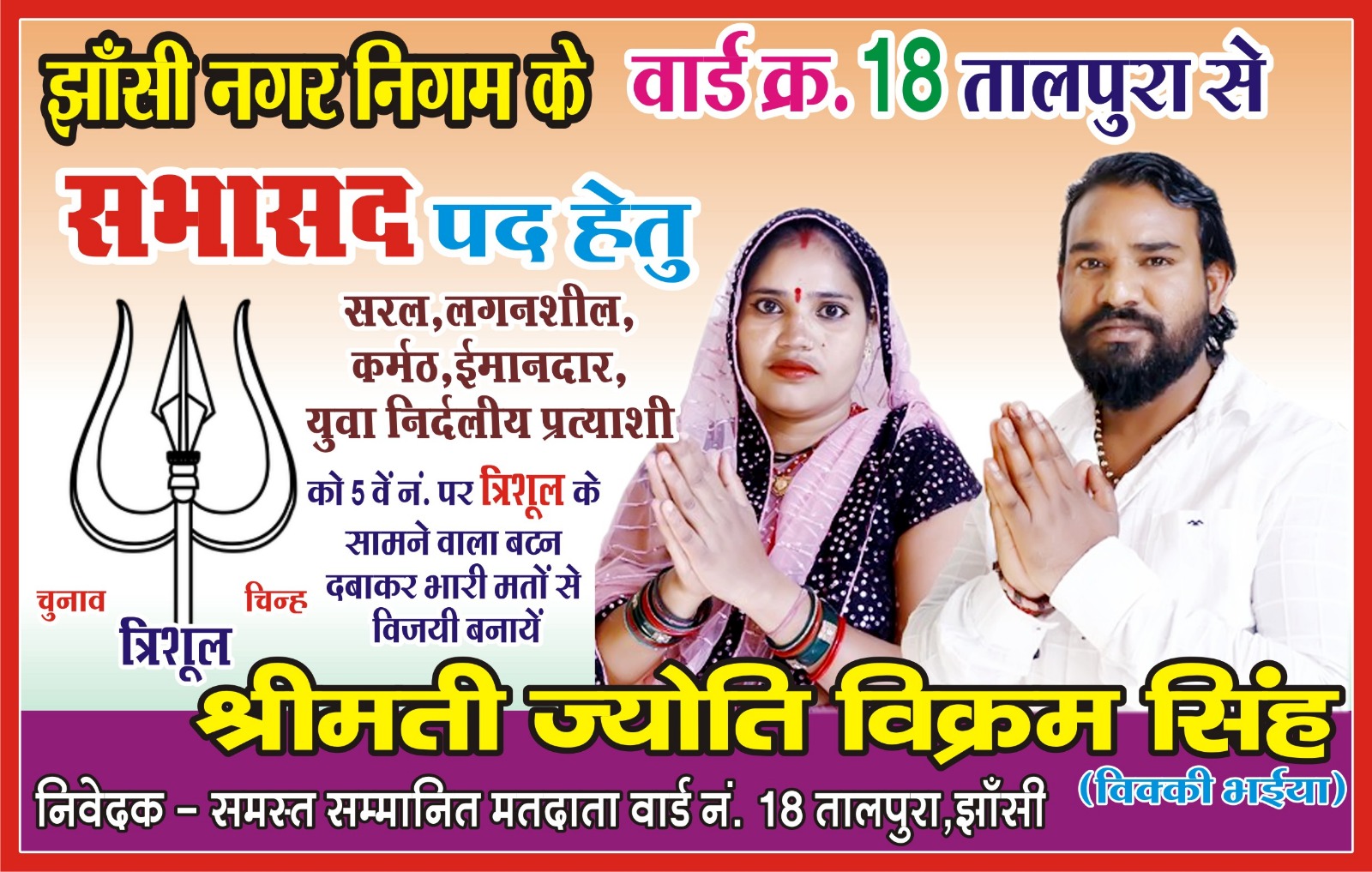 झांसी। जहां एक और वाल्मिक समाज के किसी भी व्यक्ति को नगर निगम के चुनाव में पार्टी द्वारा सम्मान न दिए जाने से वाल्मिक समाज में अक्रोश बना हुआ है। वही दूसरी ओर अपने समाज का मान सम्मान बनाए रखने के लिए वार्ड नंबर 18 तालपुरा से पार्षद पद पर प्रत्याशी के रूप में महिला ज्योति विक्रम मैदान में है। ज्योति विक्रम ने बताया की उन्हे क्षेत्र की जनता से आशीर्वाद दिया और वह अपने तालपुरा वार्ड को उत्तर प्रदेश का उत्तम वार्ड बनाने में कोई कसर नहीं छोड़ेगी।