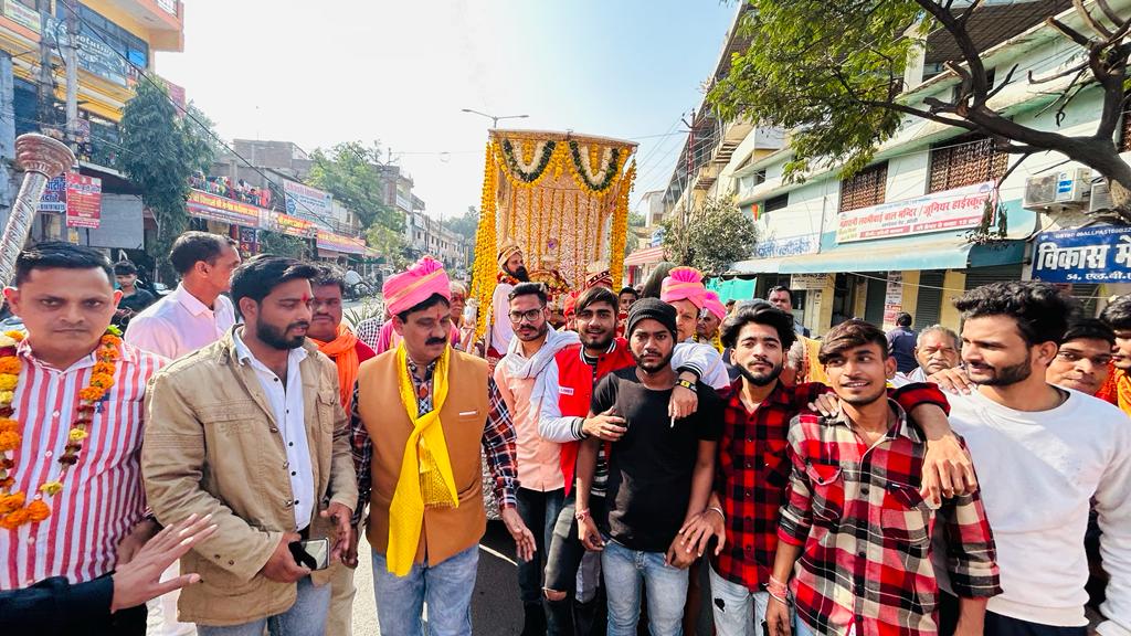 झाँसी। विवाह पंचमी महोत्सव की धूम महानगर में शुरू हो चुकी है। रविवार को श्रीरामजानकी मंदिर मेहंदी बाग से भव्यता के साथ श्रीराम बारात का आयोजन किया गया, बारात ने नगर के प्रमुख मार्गो का भ्रमण किया। विभिन्न स्थानों पर बारात का स्वागत सत्कार किया गया। विवाह पंचमी के अवसर पर मेहंदी बाग स्थित श्रीरामजानकी मंदिर में विवाहोत्सव के क्रम में भगवान् श्रीराम की बारात नगर भ्रमण के लिए निकली। रथ पर सवार भगवान् श्रीराम के स्वरूप के दर्शन कर नगरवासियों ने पुण्य लाभ प्राप्त किया। बारात मंदिर के मुख्य पुजारी महंत रामप्रिय दास व उनके उत्तराधिकारी महंत प्रेमनारायण की अगुवाई में व राष्ट्रभक्त संगठन के केंद्रीय अध्यक्ष अंचल अडजरिया के संयोजन में आगे बड़ रही थी। हजारों की संख्या में भक्तों की टोली धार्मिक धुनों पर थिरक रहे थे, महिलाओं अपने सर पर कलश धारण कर भगवान् के भजनों का गान कर आगे बड़ रहीं थीं। बारात आशिक चौराहा से होते हुए, खांडेराव गेट, पंचकुइयां, कोतवाली, मानिक चौक, सिंधी तिराहा, सर्राफा बाजार, नई बस्ती आदि क्षेत्रों का भ्रमण कर वापिस श्रीरामजानकी मंदिर पर समाप्त हुई। अंचल अडजरिया ने बताया कि 28 नवंबर को भगवान् की पैर पखराई, रामकलेवा, राम अर्चन व भण्डारे का आयोजन किया जायेगा। इस अवसर पर भाजपा जिलाध्यक्ष मुकेश मिश्रा, दीपू, प्रवीण, सुधांशु, राजकुमार गोस्वामी, अमित गोस्वामी, अर्पित शर्मा, राहुल गोस्वामी, दीपक वर्मा, प्रियांशु, सोनू रायकवार, अनिल दीक्षित, अनिल अडजरिया, हेतराम रामायणी, केके खरे सहित हजारों की संख्या में भक्तगण उपस्तिथ रहे।
