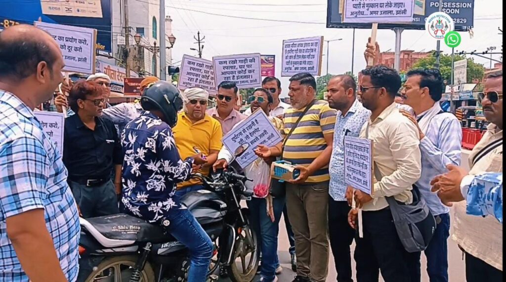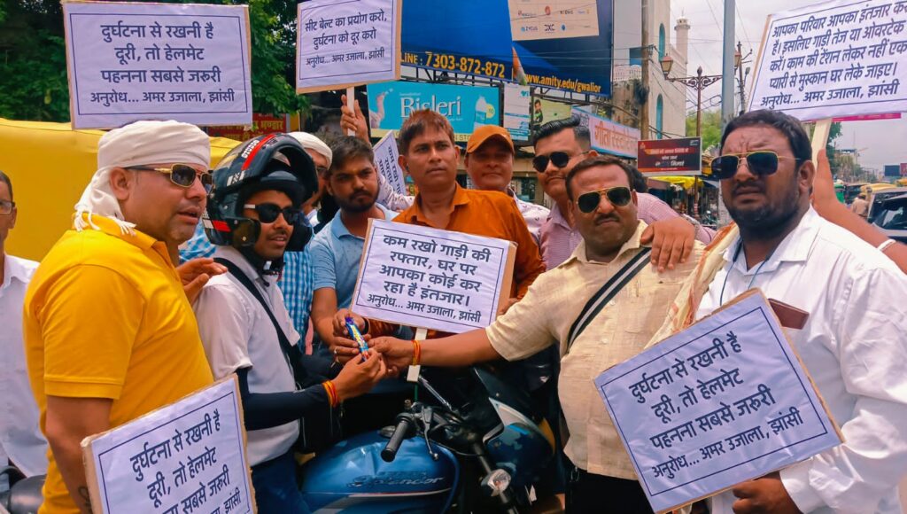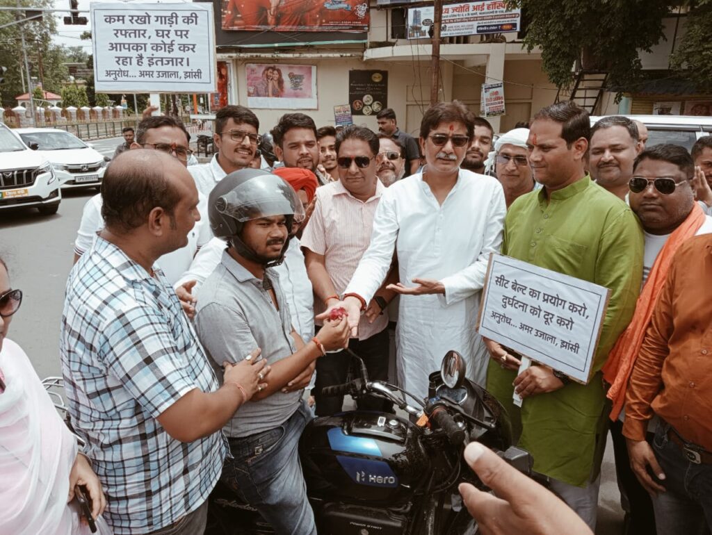 झांसी। अमर उजाला समाचार पत्र की ओर से चलाए जा रहे यातायात जागरूकता अभियान में मीडिया, भाजपा पार्टी और हिंदू संगठनों ने अभियान में भाग लेकर वाहन चालकों को यातायात नियमों का पालन करने की अपील की।रविवार को अमर उजाला संपादक पुनीत शर्मा और सह संपादक विकास सनाद्ध्य के नेतृत्व में यातायात व्यवस्था को चुस्त दुरुस्त रखने और वाहन चालकों को यातायात नियमों का पालन करने की अपील के लिए मीडिया, भाजपा नेता और हिंदू संगठन ने अभियान चलाया। इस अभियान के तहत दो पहिया वाहन चालक जो हेलमेट पहनकर वाहन चला रहे थे उन्हे सम्मानित करते हुए चाकलेट भेंट की गई और उनसे अपील की गई की वह अपने सभी आस पास के लोगों को भी यातायात नियमों का पालन करने की जानकारी दे। साथ जो चार पहिया वाहन चालक सीट बेल्ट लगाकर वाहन चलाते मिले उन्हे भी चाकलेट देते हुए अपील की गई। वही जो दो पहिया वाहन चालक बिना हेलमेट के वाहन चलाते और चार पहिया वाहन चालक बिना सीट बेल्ट वाहन चलाते मिले उन्हे रोक कर हाथ जोडकर अपील की गई की जान है तो जहान है, इसलिए यातायात नियमों का पालन करते हुए वाहन चलाए और उन्हे फूल देकर हाथ जोडकर अपील की गई। इस दौरान सांसद अनुराग शर्मा, झांसी मीडिया क्लब अध्यक्ष मुकेश वर्मा, वरिष्ठ पत्रकार कुंदन सोलंकी, आशीष दुवे, बबलू रमैया, रवि साहू, धीरज शिवहरे, प्रभात सहनी, अमित रावत, राहुल कोस्टा, वासु, मुख्तार खान, विवेक राजौरिया, आयुष साहू, बृजेश परिहार, रवि शंकर सेठी, नईम, पारस शर्मा, नेताओ में अमित साहू, बजरंग दल से विनोद अवस्थी आदि मौजूद रहे।
