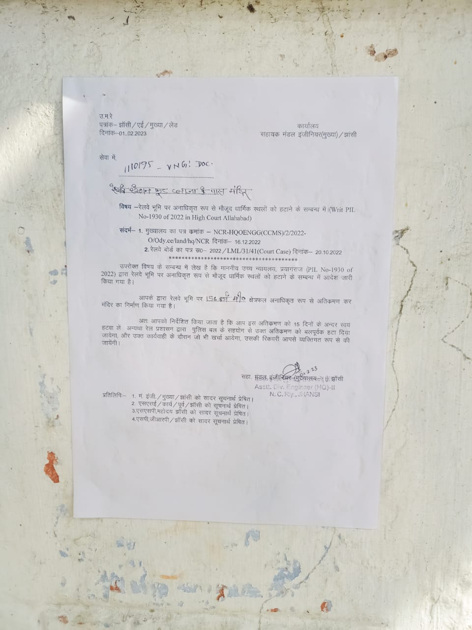 झांसी। रेलवे की जमीन पर अनाधिकृत रूप से बने धार्मिक स्थलों को हटाने का रेलवे ने कार्य शुरू कर दिया है। इसके चलते रेलवे ने मंदिर पर नोटिस चस्पा कर सूचित कर दिया है।जानकारी के मुताबिक रेलवे ने वीरांगना महारानी लक्ष्मी बाई रेलवे स्टेशन परिसर में बने मंदिर पर नोटिस चस्पा करते हुए सूचित किया है, कि वह पंद्रह दिवस के अंदर मंदिर हटा लें। अन्यथा रेलवे पुलिस बल का उपयोग कर मंदिर को हटाएगी इस दौरान आने वाला खर्च भी मंदिर के कमेटी से लिया जाएगा।
