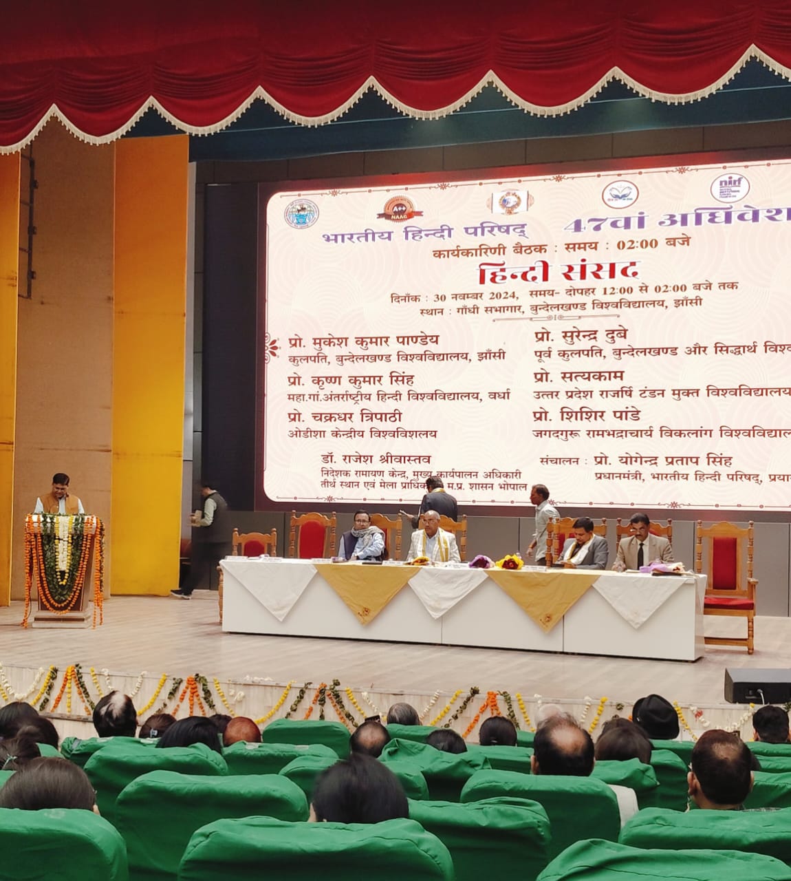 झांसी। भारतीय हिंदी परिषद के 47वे अधिवेशन और “भारतीय ज्ञान परंपरा और हिंदी” विषयक त्रिदिवसीय अंतर्राष्ट्रीय संगोष्ठी के दुसरे दिन हिंदी संसद का आयोजन किया गया. संसद में देश के 5 विश्वविद्यालयों के कुलपतियों ने हिस्सा लिया. हिन्दी संसद कार्यक्रम को संबोधित करते समय बुन्देलखण्ड विश्वविद्यालय के कुलपति प्रो. मुकेश कुमार पाण्डेय ने कहा कि यदि कोई हिन्दी का विद्यार्थी किसी दूसरी भाषा सीखकर पर्यटन के क्षेत्र में बुन्देलखण्ड की गाथा को बताएगा तो पर्यटन के माध्यम से बुन्देलखण्ड को दुनिया में पहचान मिलेगी। इसे यदि पाठ्यक्रम में जोड़ा जाएगा तो निश्चित रूप से उसका लाभ मिलेगा। उन्होंने कहा कि हिन्दी के प्रोफेसर तो शब्दों के जादूगर होते हैं वह यदि मैनेजमेंट, ह्यूमन रिर्सोस आदि पाठ्यक्रम में शामिल करें तो हिन्दी वाले विद्यार्थी काउंसलिंग और सोशल मीडिया के लिए कंटेंट राईटिंग जैसे विषयों पर काम कर सकते हैं।पूर्व कुलपति प्रो. सुरेंद्र दुबे ने कहा कि राष्ट्रीय शिक्षा नीति का फार्मूला हिन्दी के प्रतिकूल है ऐसे में हमारी जिम्मेदारी महत्वपूर्ण हैं। पिछले दिनों मुझसे दक्षिण के एक व्यक्ति ने पूछा कि हमें हिन्दी जबर्दस्ती सिखाएंगे क्या ? इस पर मैंने जवाब दिया कि जबर्दस्ती नहीं की जा सकती है। उन्होंने कहा कि आर्य कहीं से नहीं आए बल्कि वह यहां से बाहर गए हैं। हमारे कई सारे शब्द इसीलिए फारसी, तुर्की और लेटिन में भी हैं। तमिल के बहुत से भोजपुरी में हैं। उत्तर-दक्षिण का विभेदीकरण कर दिया गया। उत्तर-दक्षिण के लोगों का एक विशेषज्ञ ने 4-5 हजार डीएनए का मेल करवाया। सबका डीएनए एक है। हिन्दी वाले लोगों को पूर्वोत्तर और दक्षिण की भाषाएं सीखनी होंगी। प्रो. शिशिर पांड ने कहा कि क्षेत्रीय और जनपद के लेखकों के लेखन कम महत्वपूर्ण नहीं हैं भले ही वह प्रकाशित नहीं हुए हैं। 1900 के करीब पत्र-पत्रिकाओं की बाढ़ आई और उनमें से कई का वर्तमान में शताब्दी वर्ष चल रहा है। प्रो. कृष्ण कुमार सिंह ने कहा कि अंग्रेजी के सामने हिन्दी पाठ्यक्रम के सामने कई चुनौतियां थी। मान्यता नहीं मिलती थी। साथ ही दक्षिण की भाषाओं से हमारा संबंध मजबूत होना चाहिए। दक्षिणवालों का कहना है कि हम उन्हें महत्व नहीं देते हैं। हम उनके लेखन और उत्कृष्ट कार्य का कहीं भी जिक्र नहीं करते हैं। उनकी रचनाओं का भी जिक्र होना चाहिए। यदि हम ऐसा नहीं करेंगे तो पिछड़ जाएंगे। प्रो. चक्रधर त्रिपाठी ने भी अपने विचार व्यक्त किए। कार्यक्रम के अंत में अतिथियों ने शोधार्थियों और शिक्षकों के सवालों के जवाब दिए।कार्यक्रम में बुन्देलखण्ड और सिद्धार्थ विश्वविद्यालय के पूर्व कुलपति प्रो. सुरेन्द्र दुबे, महात्मा गांधी अंतरराष्ट्रीय हिन्दी विश्वविद्याल