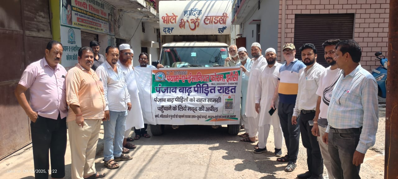 पंजाब में आई बाढ़ के बाद मची तवाही का सामना कर रहे बाढ़ पीड़ितों की मदद के लिए झांसी से पयाम ए इंसानियत फोरम दीनदयाल नगर द्वारा राहत सामग्री से भरा ट्रक रवाना किया गया जिसमें गेहूं, कपड़े,गद्दे,बैड सीट के साथ अन्य जरूरी सामान के अलावा 4 लाख रुपए की नगद धन राशि भेजी गई है इस मौके पर अलीम अहमद,अकील अहमद,हाजी इस्लाम, अब्दुल रहमान,हाजी सलीम खान जब्बार ख़ान, दिलीप कुमार,साहिर अली, अज़ीज़ खान, तैय्यब अली, सलमान खान पेश इमाम संगम बिहार मस्जिद के अलावा वरिष्ठ शायर जाहिद कौंचवी जैनुल आबेदीन खासतौर पर उपस्थित रहे।