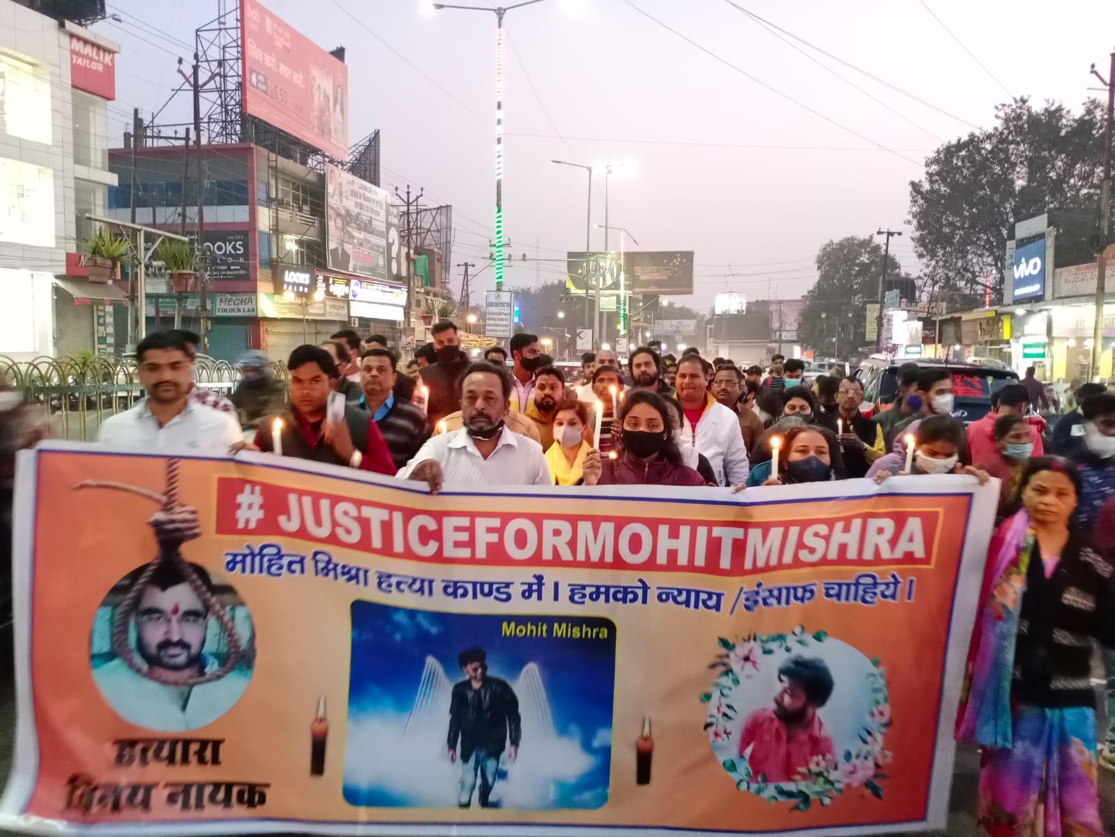 झांसी। जीवन शाह तिराहे पर पंद्रह दिन पूर्व जाम के दौरान हुए झगड़े में बाइक सवार द्वारा मोहित मिश्रा की गोली मारकर की गई हत्या कांड के आरोपी को कठोर सजा दिलाने के लिए झांसी की जनता सड़कों पर उतरी। मंगलवार को मोहित मिश्रा के परिजनों सहित सैंकड़ों लोग हाथों में केंडिल लेकर पैदल मार्च करते हुए मांग कर रहे थे की मां बाप के इकलौते चिराग मोहित मिश्रा की बीच चौराहे पर गोली मारकर हत्या करने वाले आरोपी विनय नायक को कठोर से कठोर सजा दी जाए। मालूम हो की 29 जनवरी को जीवन शाह तिराहे पर जाम लगने के दौरान वाहन टकराने पर विवाद हो गया था। इस दौरान विनय तिवारी ने अपनी लाइसेंसी पिस्टल से मोहित को गोली मार दी थी। जिसने उपचार के दौरान मोहित की मौत हो गई थी।