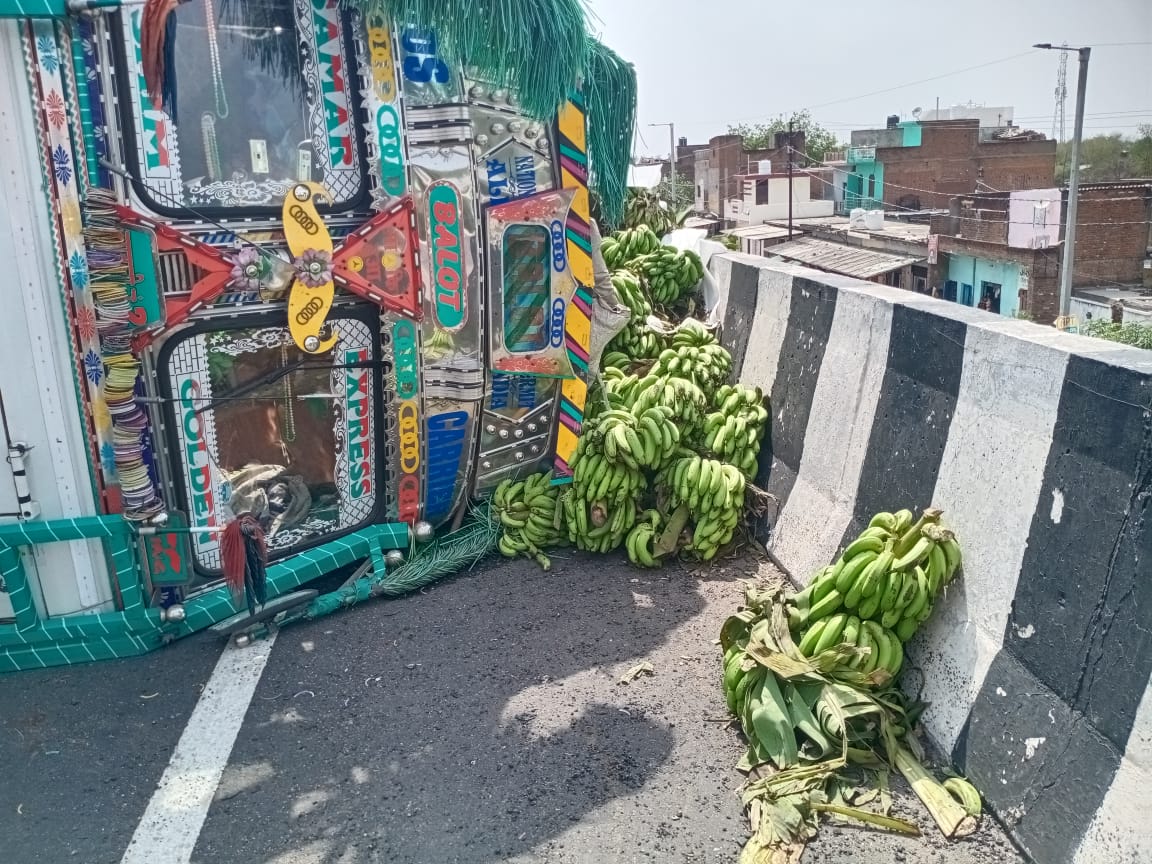 झांसी। चेन्नई से केले भरकर दिल्ली की जा रहे ट्रक के चालक का संतुलन बिगड़ गया। जिससे हाइवे पर ट्रक पलट गया। गनीमत रही कि ट्रक के आस पास से उस समय कोई वाहन नहीं गुजरा नहीं तो बड़ा हादसा हो सकता था। जानकारी के मुताबिक ट्रक चालक वाजिद निवासी मुरादनगर गाजियाबाद ट्रक क्रमांक आरजे 11 सी जी 8749 में चेन्नई से कैले भरकर गाजियाबाद जा रहा था। जैसे ही वह रक्सा टोल से ग्वालियर रोड के लिए हाइवे पर होते हुए ग्राम डेली में ओवर ब्रिज के ऊपर पहुंचा तभी पीछे से आ रही एक कार को बचाने के प्रयास में चालक अपना संतुलन खो बैठा और ट्रक पलट गया। कैले से भरे ट्रक को पलटता देख वहां कई लोग मौके पर आ गए। इससे पहले कि कोई कैले लूट कर ले जाता है,इसकी सूचना मिलते ही एन एच के कर्मचारी पहुंच गए। कर्मचारियों की मदद से ट्रक में फंसे चालक को क्लीनर को बाहर निकाला गया ओर क्रेन को मौके पर बुलाकर ट्रक उठवाने का प्रयास शुरू कर दिया था।