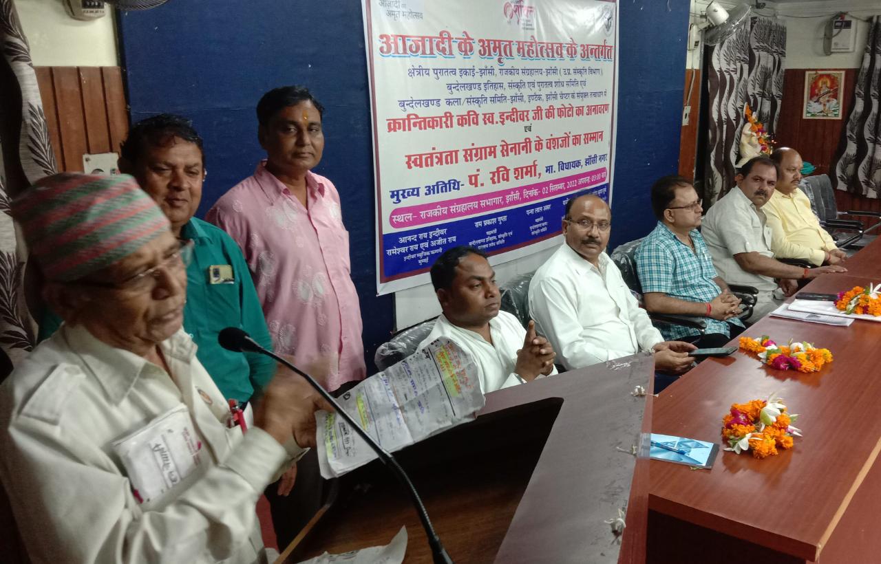 झांसी। आजादी के अमृत महोत्सव के अंतर्गत क्रांतिकारी कवि व गीतकार इन्दीवर (मूल नाम श्याम लाल राय) की फोटो का अनावरण तथा स्वतंत्रता संग्राम सेनानी के वंशजों का सम्मान राजकीय संग्रहालय में भव्यता से किया गया। क्षेत्रीय पुरातत्व इकाई झांसी, राजकीय संग्रहालय झांसी उत्तर प्रदेश संस्कृति विभाग, बुंदेलखंड इतिहास संस्कृति एवं पुरातत्व शोध समिति, बुंदेलखंड कला संस्कृति समिति, इण्टैक झांसी चैप्टर के संयुक्त तत्वावधान में आयोजित समारोह के मुख्य अतिथि विधायक पं रवि शर्मा ने कहा कि इन्दीवर जी को वह ख्याति मिलना चाहिए जो झांसी के उनके समतुल्य विभूतियों को मिली है। इसके लिए यह कार्यक्रम एक अच्छी शुरुआत है। अतिथियों का स्वागत इन्दीवर के परिजन आनंद राय, रामेश्वर राय, अजीत राय, सुदर्शन शिवहरे ने किया। विशिष्ट अतिथि क्षेत्रीय पुरातत्व अधिकारी डॉ एस के दुबे, वरिष्ठ पत्रकार मोहन नेपाली, वीरेंद्र राय, डॉ प्रदीप तिवारी, डॉ मनोज कुमार यादव रहे। स्वतंत्रता संग्राम सेनानी पं सूर्य प्रताप दुबे, भैरौ प्रसाद राय, पं बाबूलाल दुबे, बाबू कालिका प्रसाद अग्रवाल के वंशजों को शॉल एवं श्रीफल प्रदान कर सम्मानित किया गया। कार्यक्रम का सफल संचालन डॉ मनमोहन ने किया। राजकीय संग्रहालय की बीथिका प्रभारी डॉ उमा पाराशर ने आभार व्यक्त किया। इन्दीवर के गीतों की बांसुरी वादन के द्वारा लतीफ मोहम्मद व डॉ प्रमोद दीक्षित ने प्रस्तुति दी जिस पर सभी मंत्रमुग्ध हुए। इस अवसर पर चतुर्भुज राय, पार्षद उमा शंकर राय, श्रीमती लक्ष्मी राय, बालकृष्ण राय, भरत राय, कमलेश राय, कामिनी बघेल, प्रगति शर्मा, सोम तिवारी, अखिलेश दुबे, गिरिजा शंकर राय समेत गणमान्य उपस्थित रहे।
