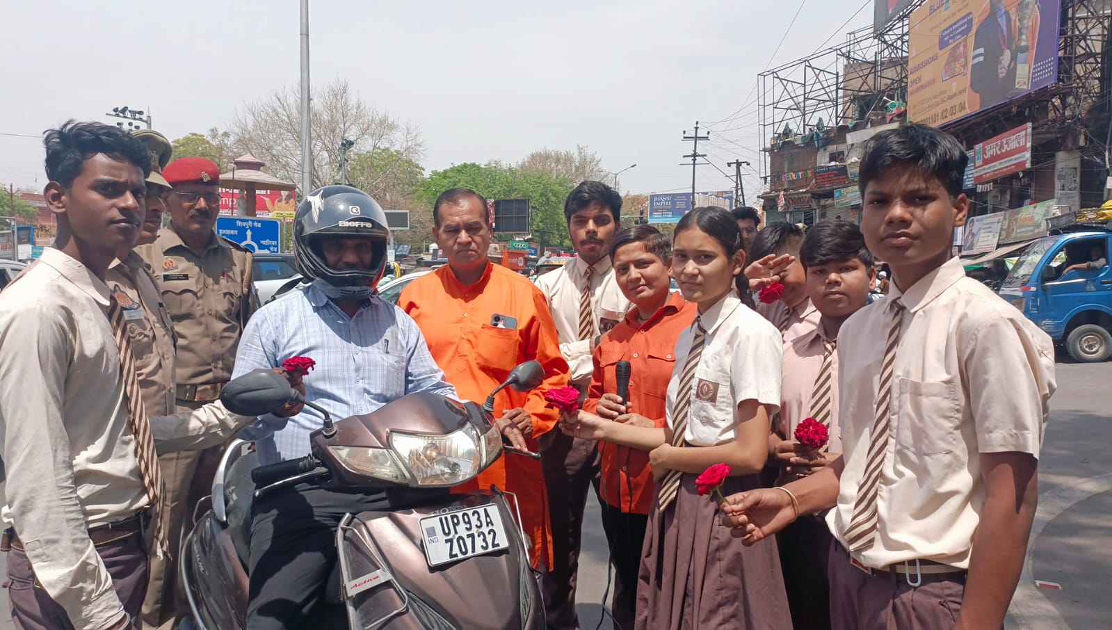 झांसी। भारत निर्वाचन आयोग के आदेशानुसार ,जिलाधिकारी /जिला निर्वाचन अधिकारी अविनाश कुमार के कुशल नेतृत्व में लोकसभा सामान्य निर्वाचन 2024 (स्वीप)अभियान के क्रम में आज झांसी स्थित इलाइट के व्यस्ततम चौराहे पर यातायात पुलिस की ट्रैफिक वार्डन कुमारी प्रगति शर्मा द्वारा , क्षत्रिय कलचुरी कलवार महासंघ के अध्यक्ष अजीत राय के मुख्य आतिथ्य तथा यातायात विभाग झांसी से टी एस आई शशिकांत के विशिष्ट आतिथ्य में सीपरी बाजार झांसी के अहिल्याबाई पब्लिक स्कूल के छात्र -छात्राओं द्वारा इलाइट चौराहे से निकलने वाले प्रत्येक वाहन चालकों को गुलाब का फूल देकर शत प्रतिशत मतदान के लिए प्रेरित किया तथा झांसी का मतदान प्रतिशत बढ़ाने हेतु बच्चों द्वारा नारे भी लगाए गए ।संचालन ट्रैफिक वार्डन दीपशिखा शर्मा ने किया।