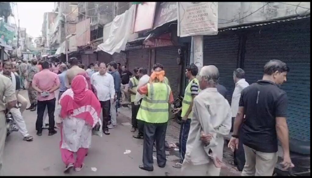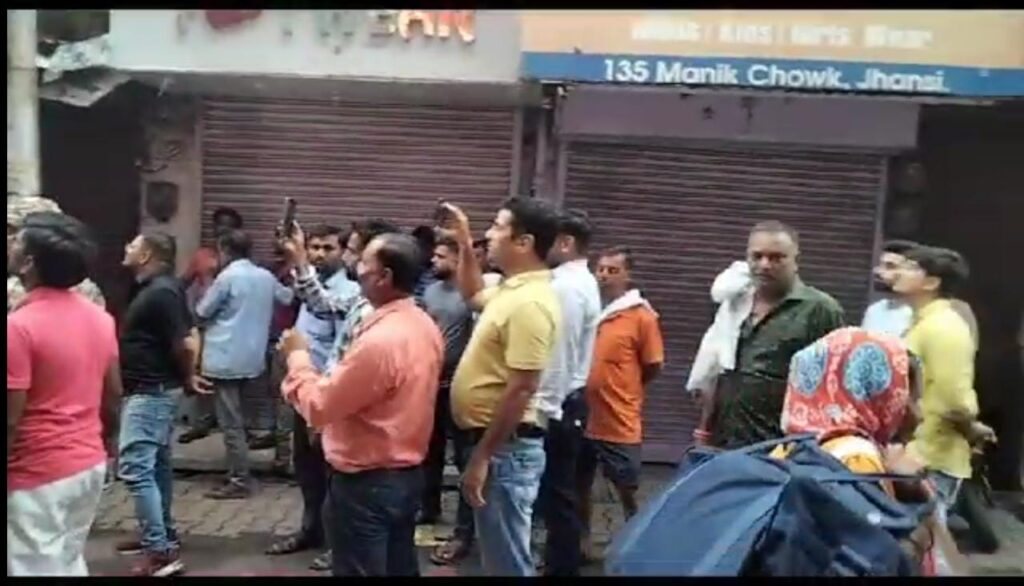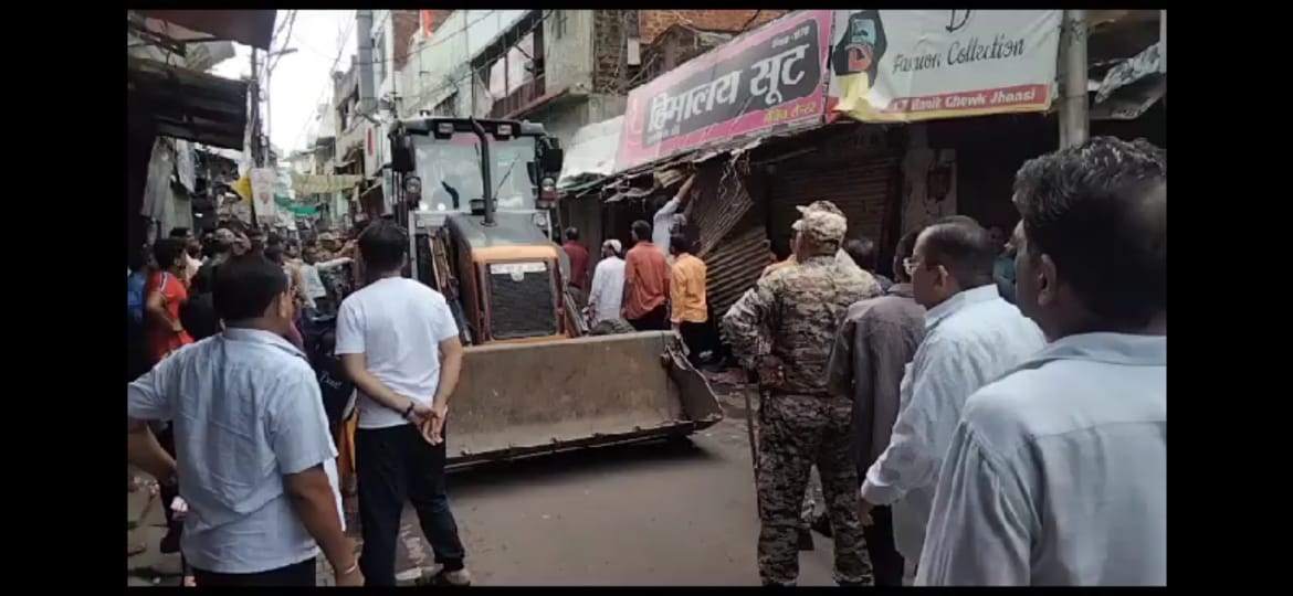 झांसी। नगर निगम की टीम अतिक्रम हटाने जैसे ही मानिक चौक बाजार पहुंची। तभी नगर निगम के बुल्डोजर को देख व्यापारी भड़क उठे। उन्होंने टीम का अतिक्रमण हटाने का जमकर विरोध करते हुए बाजार बंद कर दिया।