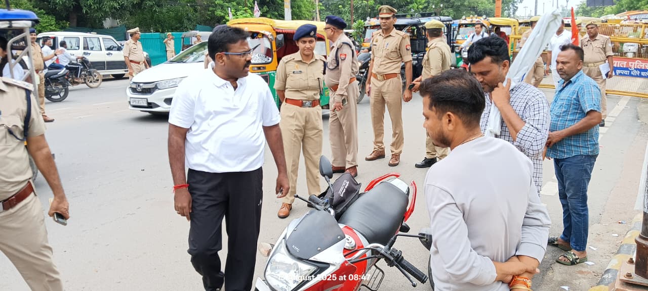 झांसी। यातायात व्यवस्था को चुस्त दुरुस्त रखने के लिए एसएसपी बीबीजीटीएस पुलिस बल के साथ खुद सड़क पर उतरे। इस दौरान उन्होंने नियम विरुद्ध वाहन चला रहे दो पहिया वाहन चालकों को यातायात के नियमों का पाठ पढ़ाया। साथ ही उन्होंने चार दर्शन से अधिक दो पहिया वाहनों के चालान भी कराए। इस दौरान ट्रैफिक पुलिस, नवाबाद थाना पुलिस सहित सीओ मौजूद रहे।