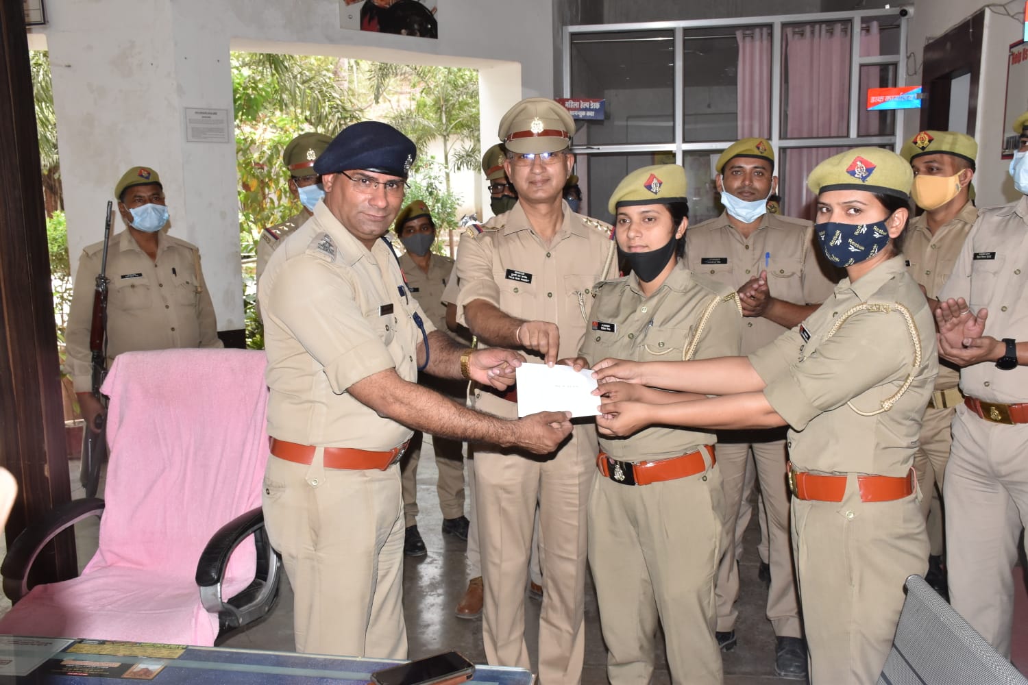झांसी। कोतवाली थाना में तैनात महिला कांस्टेबल रितिका और प्रवीन धाकड़े को एसएसपी ने ईमानदारी की मिशाल कायम करने पर नकद पुरस्कार देकर सम्मानित किया। साथ ही दोनो महिला कांस्टेबल द्वारा पचास हजार रुपए से भरा पर्स उसके स्वामी को लौटने पर उनके कार्य की भूरी भूरी प्रशंशा की। वरिष्ठ पुलिस अधीक्षक झाँसी शिवहरी मीना द्वारा थाना कोतवाली का निरीक्षण किया गया तथा एसएसपी ने निरीक्षण के उपरान्त उत्कृष्ट कार्य करने वाले अधिकारी/कर्मचारीगण को सम्मानित किया गया इसी क्रम में थाना कोतवाली में नारी सुरक्षा दल में तैनात महिला कॉन्स्टेबल 1693 रितिका व 1604 प्रवीण धाके द्वारा कोतवाली क्षेत्र में मानिक चौक के पास ड्यूटी के दौरान 50,000 रुपए लावारिस पड़े मिले थे जिसे उनके द्वारा ईमानदारी का परिचय देते हुए तत्काल प्रभारी निरीक्षक कोतवाली को अवगत कराया गया जिसपर बरामद रूपये के बारे में जानकारी की गयी जानकारी प्राप्त न होने पर थाना स्थानीय में दाखिल कराया गया । उपरोक्त दोनों महिला आरक्षीगण द्वारा किये गये इस ईमानदारी के कार्य हेतु वरिष्ठ पुलिस अधीक्षक झाँसी ने 1100 रूपये के नगद पुरस्कार से सम्मानित किया गया।
