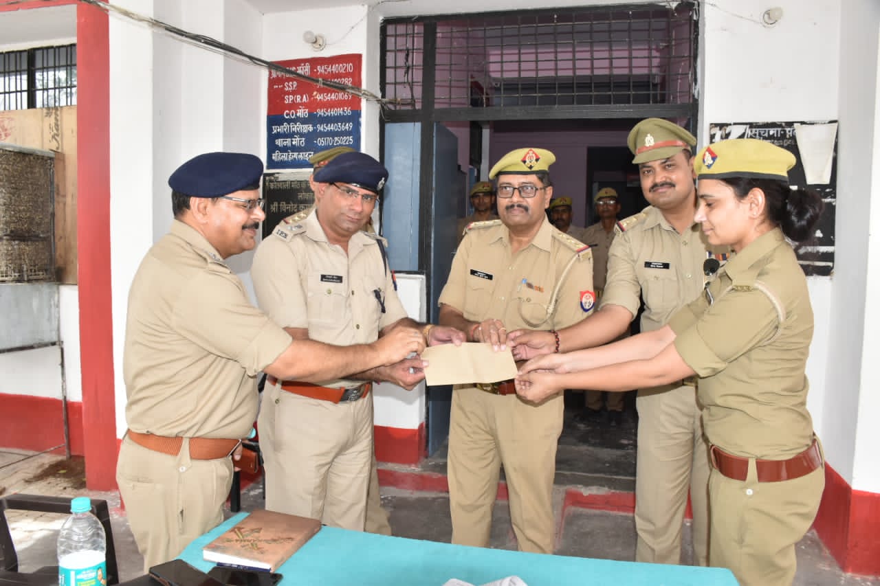 झांसी। कर्तव्य निष्ठा और विभाग के प्रति ईमानदारी से कार्य करने पर एसएसपी ने महिला सिपाहियो को नकद पुरस्कार देकर सम्मानित किया। आज एसएसपी हत्या के मामले में जांच करने घटना स्थल पहुंचे थे। यहां से वह थाना मोठ पहुंचे और आकस्मिक निरीक्षण कर शिकायती पत्र व अपराध राजिस्ट्रो का रख रखाव देख प्रसन्नता जाहिर कर महिला पुलिस कर्मियों को सम्मानित किया। सोमवार को वरिष्ठ पुलिस अधीक्षक शिवहरी मीना द्वारा आज दिनांक 30-05-2022 को थाना मोठ भ्रमण के दौरान आई.जी.आर.एस व महिला हेल्पडेस्क की पत्रावलियों का आकस्मिक निरीक्षण किया गया । द्वारा सर्वप्रथम आई.जी.आर.एस. के रजिस्टरों को चेक किया गया जिसपर अभिलेखों का रख रखाव अच्छा पाया गया तथा सभी प्रार्थना पत्रों का समयावधि निस्तारण होना पाया गया जिसपर द्वारा आई.जी.आर.एस. के कार्यों हेतु नियुक्त महिला आरक्षी 965 बंदना को 500 रूपये नगद पुरस्कार से पुरस्कृत किया गया । इसके उपरांत महोदय द्वारा महिला हेल्प डेस्क के अभिलेखों को चेक किया गया जिसमें महिला हेल्पडेस्क रजिस्टर एवं आगंतुक रजिस्टरों का अध्यावधिक होना पाया गया । जिसपर द्वारा महिला हेल्पडेस्क के कार्यों के देखरेख हेतु नियुक्त महिला आरक्षी 1762 कुशुम एवं 1662 अंजुला को 500 रूपये नगद पुरस्कार से पुरस्कृत कर सम्मानित किया गया है । निरीक्षण के दौरान पुलिस अधीक्षक ग्रामीण नैपाल सिंह, क्षेत्राधिकारी मोठ श्रीमती स्नेहा तिवारी, प्रभारी निरीक्षक मोठ संजय गुप्ता एवं अन्य अधिकारी कर्मचारीगण मौजूद रहे ।