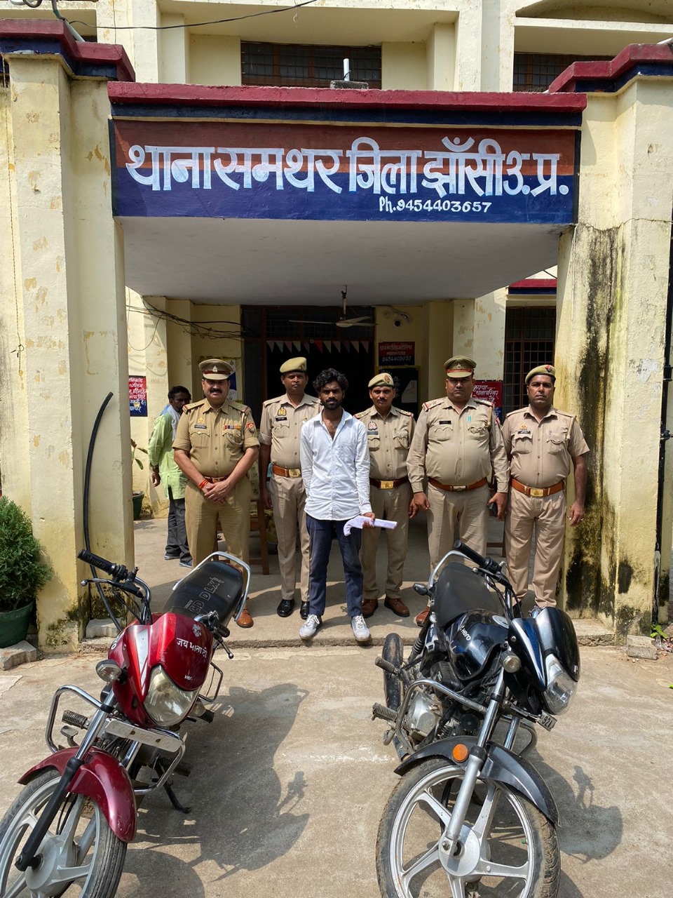 झांसी। समथर थाना पुलिस ने चोरी की बाइक समेत अभियुक्त को गिरफ्तार कर उसके कब्जे से एक तमंचा दो जिंदा कारतूस सहित दो चोरी की बाइक बरामद कर ली। पकड़े गए युवक के खिलाफ लिखा पढ़ी करते हुए पुलिस ने उसे जेल भेज दिया है।