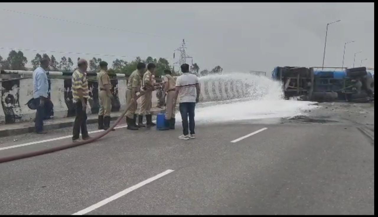 झांसी। कानपुर राजमार्ग पर रविवार की दोपहर उस समय अफरा तफरी का माहौल बन गया जब पेट्रोल डीजल से भरा टैंकर कानपुर की ओर जाते समय रास्ते में अनियंत्रित होकर पलट गया और उसमे से डीजल सड़क पर फेल गया। इससे पहले की कोई बड़ी घटना होती फायर बिग्रेड और पुलिस ने मौके पर पहुंच कर मोर्चा संभाल लिया।जानकारी के मुताबिक झांसी से भारत पेट्रोलियम का टैंकर जो दो भागों में पेट्रोल और डीजल लेकर जा रहा था। जैसे ही टैंकर थाना बड़ागांव के परीक्षा थर्मल पावर हाउस के पास ओवर ब्रिज पर पहुंचा । तभी अचानक टैंकर के दोनो पहिए पीछे के फट गए जिससे अनियंत्रित होकर पलट गया और उसके अंदर से पेट्रोल डीजल सड़क पर फेल गया। जिससे वहां का माहौल में अफरा तफरी मच गई। सूचना मिलते ही मौके पर बीपीसीएल के अधिकारी और फायर बिग्रेड व पुलिस पहुंच गई। दोनो ओर से आवागमन बंद कर सुरक्षा का माहौल पैदा करते हुए टैंकर को उठाने का कार्य शुरू कर दिया है।