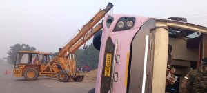 जानकारी के मुताबिक दिल्ली से मध्यप्रदेश के जिला सागर जा रही खुशबू बस सर्विस क्रमांक br 03 p b 2614 सवारियों को लेकर जा रही थी। बस में करीब तीन सवारियां मौजूद थी। सोमवार की सुबह जैसे ही बस झांसी के थाना सीपरी बाजार क्षेत्र के ग्रास लैंड के पास पंजाबी ढाबे के पास पहुंची तभी अगर जाम लगने पर बस को पीछे करने पर वह अनियंत्रित होकर पलट गई। बस के पलटते ही उसमें सवार सवारियों में चीख पुकार मच गई और सभी सवारियां फंस गई। सूचना मिलते ही क्षेत्राधिकारी नगर सहित सीपरी बाजार थाना के पुलिस फोर्स मौके पर पहुंचा और बस के खिड़कियों के शीशे तोडकर सवारियों को सुरक्षित बाहर निकाल कर उन्हें गंतव्य की ओर रवाना किया। वहीं तीन सवारियां को हल्की चोट आने पर उनका प्राथमिक उपचार पास के सामुदायिक स्वास्थ्य केंद्र में कराया। घायलों के नाम गौरव कुमार व उसके दो परिवार के सदस्य बताए जा रहने। वहीं क्रेन मंगवा कर बस को खड़ी कराने के बाद उसमें सवारियों को रवाना किया।