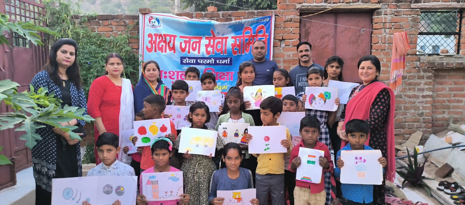 झाँसी। ग्राम ढीमरपुरा में समाजसेवी संस्था अक्षय जन सेवा समिति द्वारा आयोजित बच्चो कि पाठशाला में समिति द्वारा एक चित्रकला प्रतियोगिता का आयोजन किया । प्रतियोगता में छात्र एवं छात्राओं ने प्रतिभाग किया। चित्रकला प्रतियोगिता का विषय स्वच्छ भारत रखा गया था । स्कूल के कई छात्र छात्राओं ने कई सुंदर चित्र बनाएं। समिति का मुख्य उद्देश्य समाज में जागरूकता फैलाना व बच्चों में रचनात्मक एवं कलात्मक रुचि को उभारना है। संस्था कई बार स्कूलों में चित्रकला प्रतियोगिता , सामान्य ज्ञान प्रतियोगिता व अन्य जागरूकता शिविर का आयोजन कर चुकी है। वही समिति कि अध्यक्ष सविता पचौरी ने बताया कि संस्था ने करोना काल में भी सैनिटाइजेशन कार्य, फ्री राशन बाटा व लोगों को चिकित्सा सुविधा भी उपलब्ध करवाई । संस्था इसके अलावा सेनेटरी पैड डिस्ट्रीब्यूशन, कपड़ों का डिस्ट्रीब्यूशन, खिलौनों का डिस्ट्रीब्यूशन, कॉपी किताब स्टेशनरी का डिस्ट्रीब्यूशन व कई तरह के पोस्टर के माध्यम से डेंगू मलेरिया कोरोना व अन्य सामाजिक मुद्दों पर जागरूकता के कार्यक्रम करती रहती है । इस दौरान् कार्यक्रम सयोजक डागौर मोहन यादव् ,ज्योति अग्रवाल , आशा यादव, सीमा शर्मा, अनिल जयसवाल आदि लोग उपस्थित रहे। संचालन ज्योति अग्रवाल ने किया।