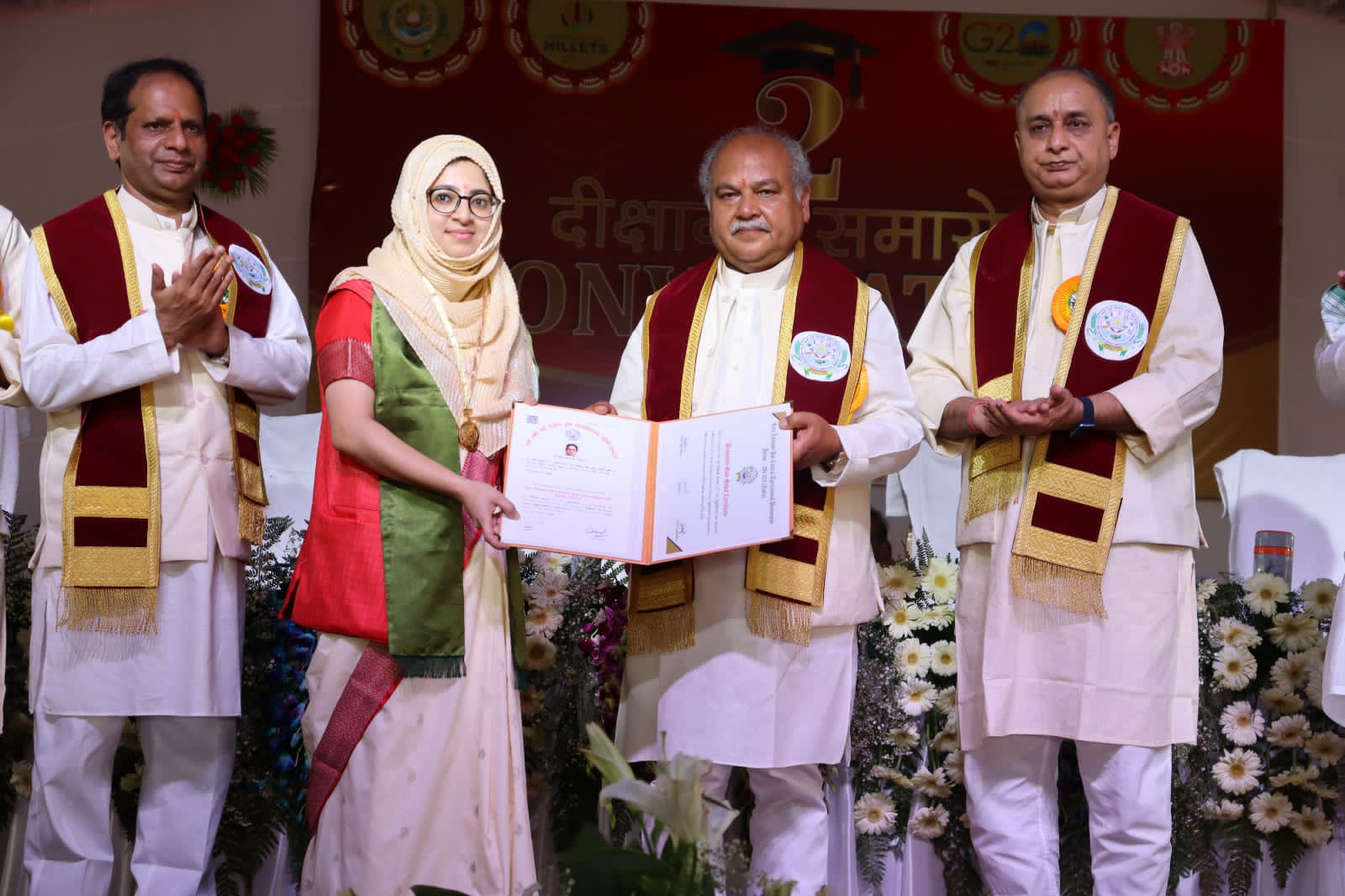 झांसी। श्री अन्न की खेती बढ़ाकर छोटे किसानों की ताकत बढ़ाना प्रधानमंत्री का उद्देश्यझांसी/ नई दिल्ली, 11 मार्च 2023, रानी लक्ष्मीबाई केंद्रीय कृषि विश्वविद्यालय, झांसी का द्वितीय दीक्षांत समारोह आज केंद्रीय कृषि एवं किसान कल्याण मंत्री श्री नरेंद्र सिंह तोमर के मुख्य आतिथ्य में हुआ। यहां श्री तोमर ने नवनिर्मित महिला व पुरूष छात्रावास, अतिथिगृह तथा आडिटोरियम का शुभारंभ भी किया। इस अवसर पर श्री तोमर ने स्वर्ण पदक प्राप्त करने वाले 16 विद्यार्थियों में 14 छात्राएं होने पर प्रसन्नता जताते हुए कहा कि प्रधानमंत्री श्री नरेंद्र मोदी के नेतृत्व में देश में हर क्षेत्र में बहन-बेटियां अग्रणी भूमिका निभा रही है। उन्होंने कृषि के विद्यार्थियों से देश में किसान के रूप में भी योगदान देने का आह्वान किया।केंद्रीय मंत्री श्री तोमर ने कहा कि हमारा देश कृषि प्रधान है, एक समय कहा जाता था कि खेती उसी की है, जिसके पास पानी है लेकिन बदलते परिवेश में कहावत बदलकर इस तरह हो गई है कि खेती उसी की है, जिसके पास अच्छा ज्ञानी है। उन्होंने विद्यार्थी जीवन को सबसे सुनहरा काल बताते हुए विश्वास जताया कि कृषि विद्यार्थियों का ज्ञान देश की खेती को और उन्नत एवं विकसित बनाने में योगदान करेगा। श्री तोमर ने कहा कि बुंदेलखंड की धरती हमेशा साहस व वीरता के लिए जानी जाती है, रानी लक्ष्मीबाई व महाराजा छत्रसाल की वीरता के चर्चे देश-दुनिया में होते हैं, ऐसी पावन धरती पर मोदी सरकार द्वारा स्थापित रानी लक्ष्मीबाई केंद्रीय कृषि विश्वविद्यालय ने अल्प अवधि में ही काफी प्रगति की है। दलहन, तिलहन, सब्जी-फल, जैविक व प्राकृतिक खेती के साथ बुंदेलखंड सहित समूचा उत्तर प्रदेश कृषि की दृष्टि से प्रगति कर रहा है। उन्होंने कहा कि इस वि.वि. तथा कृषि विज्ञान केंद्रों (केवीके) सहित भारतीय कृषि अनुसंधान परिषद (आईसीएआर) के क्षेत्रीय संस्थानों ने उ.प्र. व समीपस्थ मध्य प्रदेश में अपनी महत्वपूर्ण भूमिका निभाई है। खुशी की बात है कि वि.वि., म.प्र. के दतिया जिले में पशु चिकित्सा और पशु विज्ञान तथा मत्स्य विज्ञान महाविद्यालय स्थापित करने जा रहा है, जिनके लिए भवन निर्माण कार्य प्रगति पर है। श्री तोमर ने प्रसन्नता जताते हुए कहा कि जो बुंदेलखंड कभी पलायन के लिए जाना जाता था, वहां आज कृषि का विकास सुखद स्थिति है। यह क्षेत्र फल-सब्जियों व प्राकृतिक खेती के मामले में एक हब बनें, इस दिशा में प्रयास तेज गति से होना चाहिए। साथ ही, बुंदेलखंड क्षेत्र में तिलहन की खेती भी बढ़ना चाहिए।श्री तोमर ने कहा कि पिछले 8-9 वर्षों में प्रधानमंत्री श्री मोदी के नेतृत्व में भारत सरकार द्वारा कृषि क्षेत्र में अनेक ठोस कदम उठाए गए हैं, जिनका फायदा आज देश के किसानों व कृषि क्