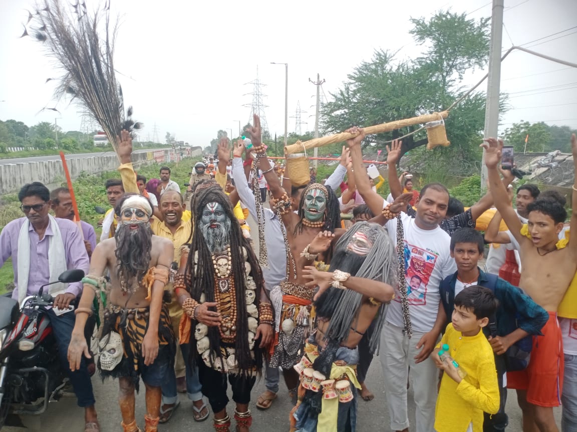 झांसी। बड़ागांव से चिरगांव भगवान शिव मन्दिर तक निकलने वाली कांवड़ यात्रा इस वर्ष नौ बी बार भी बड़े ही धूमधाम से डीजे ढोल नगाड़े के साथ निकाली गई। इस कांवड़ यात्रा में सैंकड़ों महिलाएं अपने सर पर कलश रखा कर चल रही थी, कांवड़िए कांवड़ लेकर आगे आगे भगवान भोलेनाथ के स्वरूप शिव तांडव करते हुए चल रहे थे, वही भगवान पशुपति नाथ का स्वरूप मनमोहक आकर्षण का केंद्र रहा। श्रावणमास के अंतिम सोमवार को अनूप शिवहरे देहाती, दिलीप शिवहरे के नेतृत्व में हर वर्ष की तरह इस वर्ष की विशाल कांवड़ यात्रा निकाली गई। कांवड़ यात्रा बड़ागांव के ग्राम बराठा में नदी से पवित्र जल भरकर कलश ओर कांवड़ लेकर महिलाएं ओर कांवड़िए चिरगांव स्थित भगवान शिव के मन्दिर के लिए पैदल चले। इस दौरान कांवड़ यात्रा में डीजे की धुन पर मथुरा वृंदावन से आई भगवान शिव पार्वती के स्वरूप ओर शिवतांडव की टोली ने नाचते झूमते शिव की आराधना की। करीब तीन किलो मीटर लंबी इस कांवड़ यात्रा में भगवान पशुपति नाथ का स्वरूप, भगवान शिवलिंग का स्वरूप आकर्षण का केंद्र रहा। कांवड़ यात्रा में करीब तीन से चार हजार की संख्या में पीले वस्त्रों को धारण किए महिला, पुरुष, बच्चे बम बम भोले के जयकारे के साथ कांवड़ लेकर जा रहे थे। कांवड़ यात्रा का विशाल स्वरूप बता रहा था कि बड़ागांव से लेकर चिरगांव तक आस्था का सैलाब उमड़ा है। इस दौरान कांवड़ यात्रा का जगह जगह फूल वर्षा से स्वागत किया गया साथ ही जगह जगह कांवड़ियों को जलपान की व्यवस्था भी कराई गई।