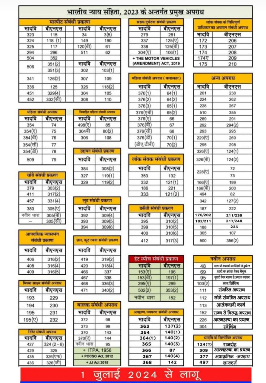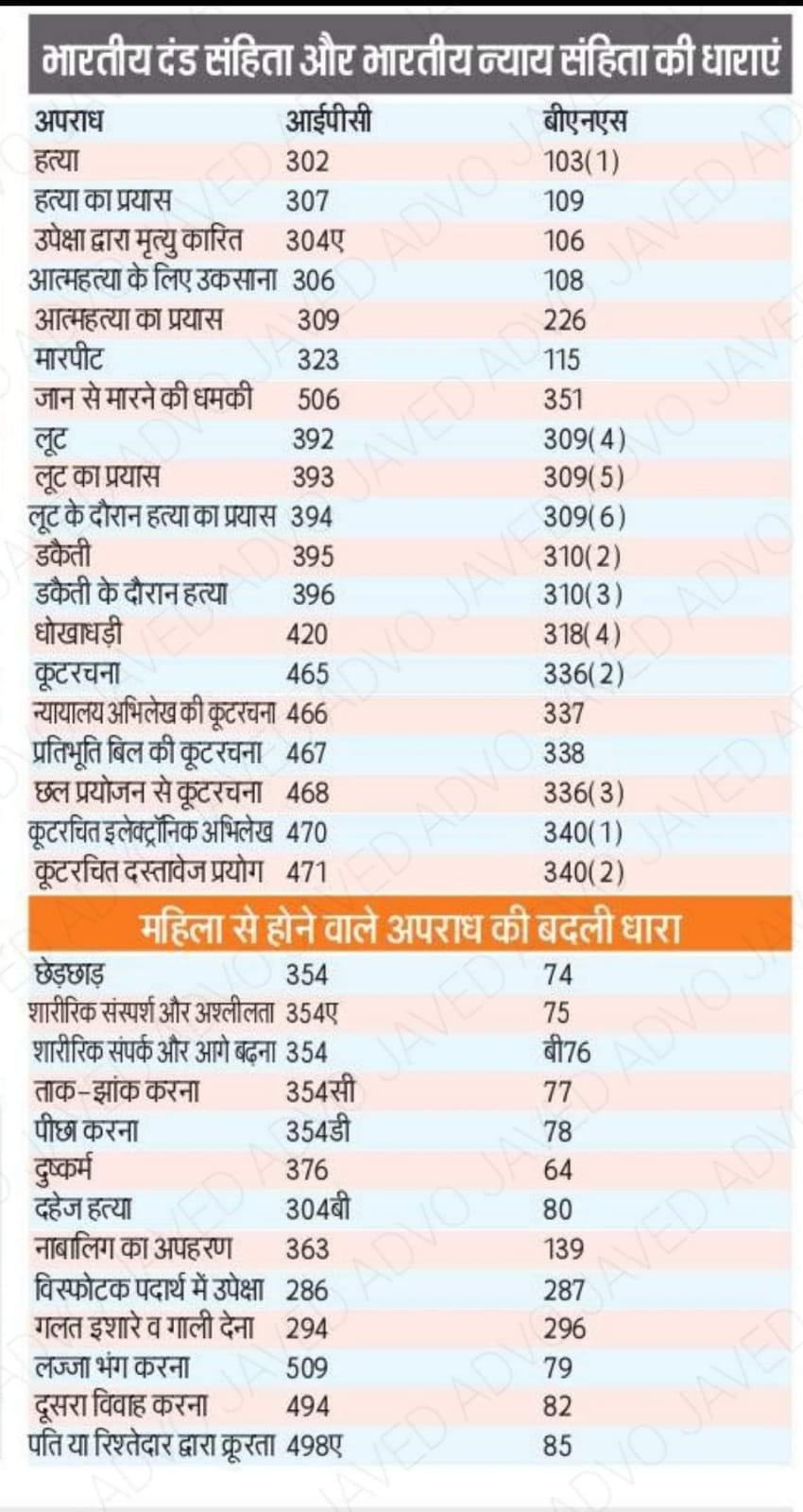 झांसी। अंग्रेजो के द्वारा बनाए गए कानून और धाराएं अब 14 घंटे बाद विदा हो जायेंगी। कानून में संशोधन करते हुए 1 जुलाई 2024 से लगी धाराएं नया कानून लागू होगा। आप भी जान जाए किस अपराध पर लगेगी कौन सी धारा। इस नए कानून से जांच प्रक्रिया में तेजी आयेगी और पीड़ित को जल्द न्याय मिलेगी। देश में आजादी 77 साल बाद आईपीसी और सीआरपीसी आज रात 12 बजे से समाप्त हो जायेगी। इसके स्थान पर देश में बनाए गए नए कानून की नई धाराएं 1 जुलाई 2024 से लागू हो जायेंगी। भारतीय न्याय संहिता और भारतीय नागरिक सुरक्षा संहिता लागू होगी। इसके लिए पुलिस विभाग ने पूरी तैयारी कर ली है। पुलिस विभाग में तैनात मुंशियो को इसकी ट्रेनिंग दी गई। किस घटना में कौन सी धाराएं लागू होंगी। हत्या, हत्या का प्रयास, दुष्कर्म, घरेलू हिंसा, छेड़छाड़, लोकसेवक संबंधी डकैती, चोरी, बाल संबंधी अपराध आदि सभी अपराध की धाराओं में परिवर्तन हो जायेगा। साथ ही बनाए गए नए कानून में हर गंभीर घटना क्रम फोरेंसिक जांच रिपोर्ट की अहम भूमिका रहेगी। साथ ही नवीन घटनाओं का अपराध कानून भी बनाया और कई धाराएं बनाई गई। जैसे शादी का झांसा देना, सुपारी देकर बालकों से अपराध कराना, संगठित गिरोह बनाकर अपराध करना धारा 111, छोटे संगठित गिरोह बनाकर 112, आतंकवादी कार्य 113, सहित कई धाराओं का परिवर्तन हुआ। पिछले 77 साल पहले ब्रिटिश सरकार द्वारा बनाए गए कानून पर देश में आजादी के बाद कमान संभालने वाली सरकार अंग्रेजो के कानून को ही चला रही थी। लेकिन देश में परिवर्तित हुई और भाजपा सरकार ने अंग्रेजों के कानून से मुक्ति दिलाते हुए नए कानून बना कर धाराओं में बदलाव कर दिया। इस नए कानून में न्यायलय में तकनीकों पर ज्याया जोर दिया। साथ ही नए कानून बनने पर सीसीटीएनएस में भी मोटीफाइड कर दिया गया है। ताकि एक जुलाई से नई धाराएं भारतीय न्याय संहिता और भारतीय नागरिक संहिता कानून की ऑन लाइन रिपोर्ट दर्ज होने में कोई परेशानी न हो।